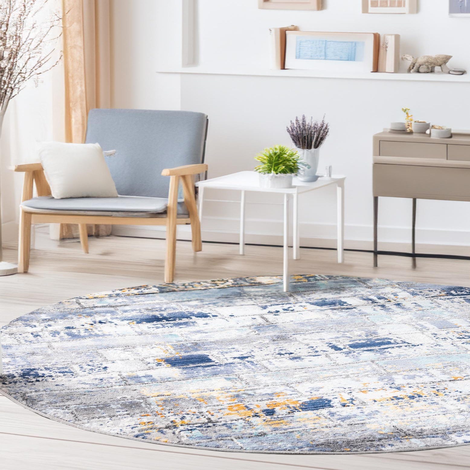 Machine-made from 70% polypropylene and 30% polyester, this piece balances a smooth, slightly lustrous finish with a reassuringly consistent weave. Its compact round shape and mixed palette work well under a circular coffee table, in a bedroom seating nook, or as a colorful focal point in an entry or home office. Pair it with warm wood furniture and metal accents for an industrial-meets-contemporary vibe, or layer it into a coastal-modern scheme where the teals and light blues echo soft textiles and natural fibers.