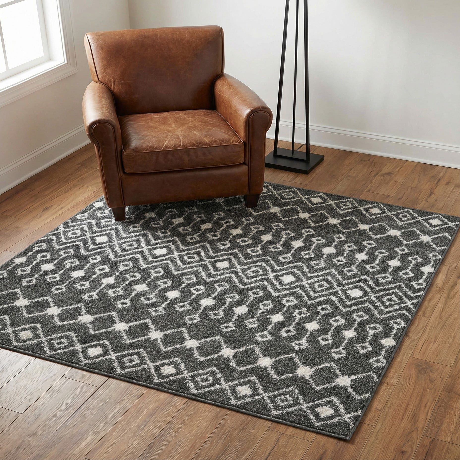 The Moroccan Trellis Collection offers a 4 Ft Square rug, machine woven from polypropylene, which ensures a durable and long-lasting addition to your space. This rug features a dark gray background accentuated by an ivory trellis pattern, imbuing it with a contemporary yet timeless appeal. The design showcases a geometric lattice with a Moroccan inspiration, making it an ideal choice for adding visual interest to a room. The texture of the rug is soft to the touch, providing comfort underfoot while maintaining a shed-free property for ease of maintenance. Its stain-resistant nature ensures that this piece remains a practical choice for high-traffic areas.