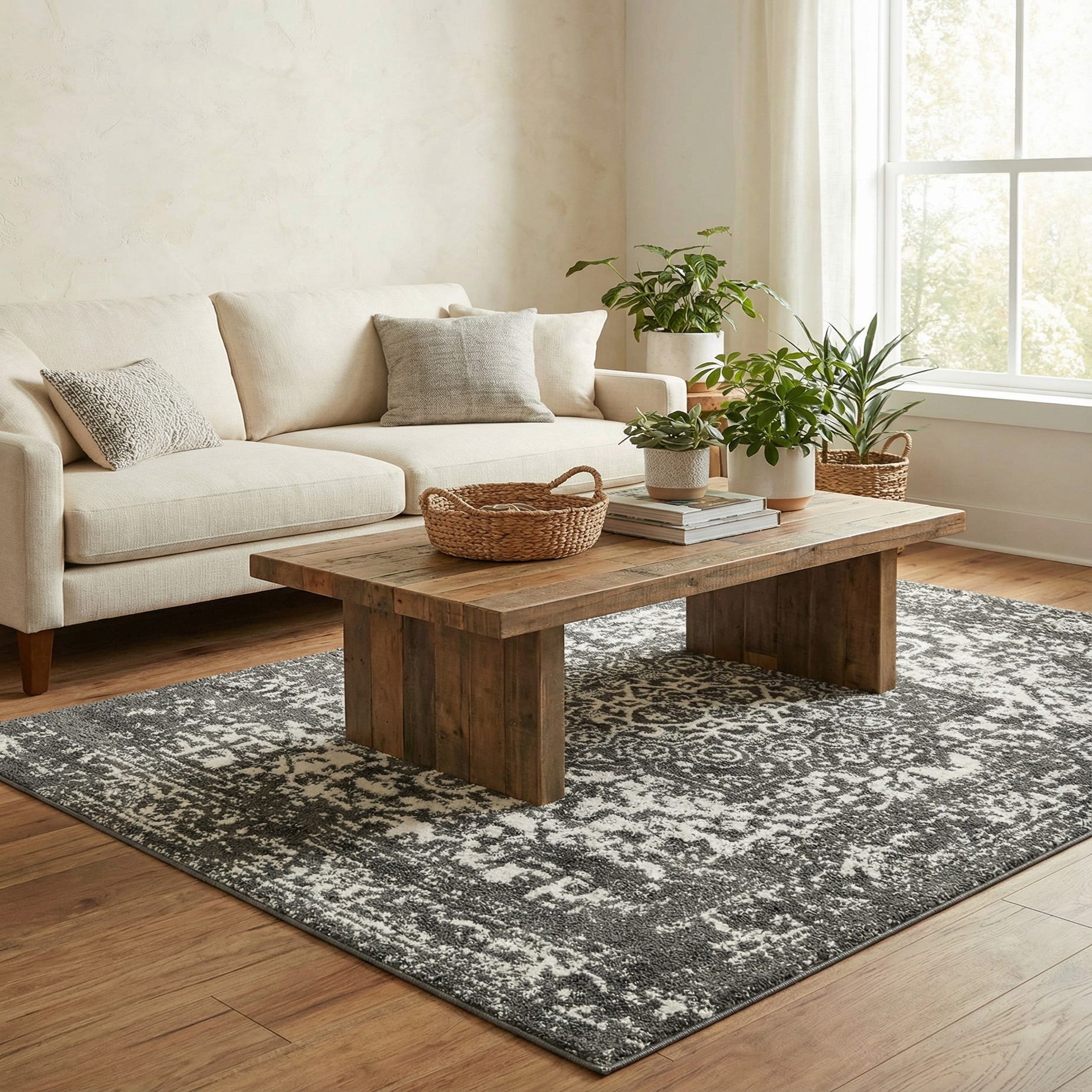 This rug works well in modern, transitional, or industrial interiors—place it beneath a coffee table to anchor a seating area, at the foot of a bed to add contrast to light linens, or in an entryway to set a neutral tone. The balanced mix of dark gray and ivory pairs easily with metal, wood, and leather furnishings, making it a practical choice when you want a refined patterned layer without overwhelming the room.