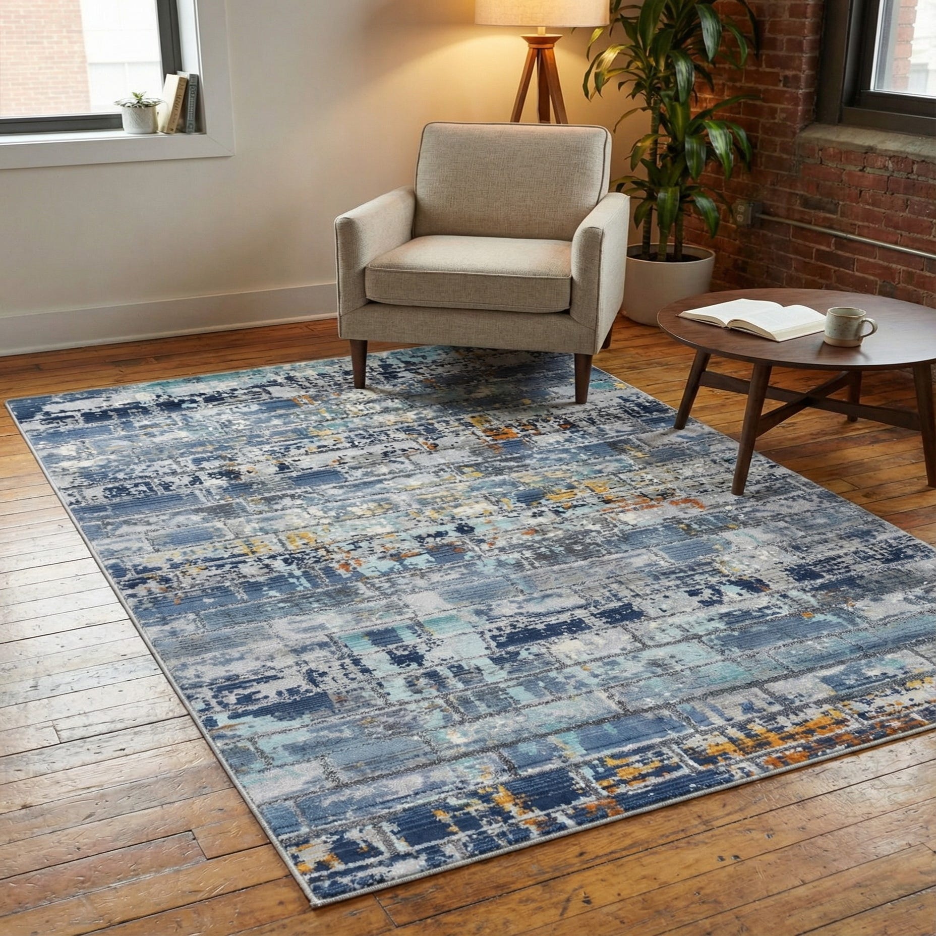 The modern, transitional style pairs easily with several design directions: place it beneath a compact seating group in a living room to anchor navy and neutral upholstery, use it in a coastal-inspired space with linen sofas and brass accents to highlight the light blues and gold, or add it to a home office or bedroom for layered texture and color. It also works well in an urban loft or mid-century setting where the geometric, weathered pattern can complement clean-lined furniture and warm-metal accents.