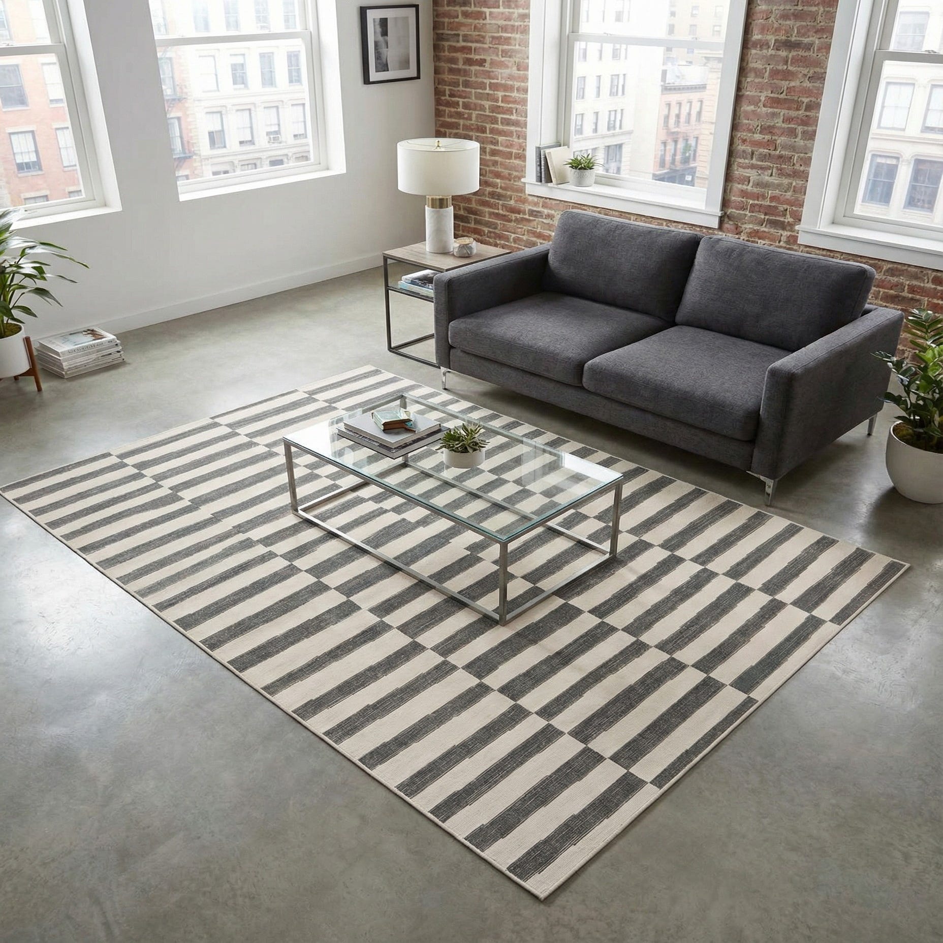 Low-profile construction produces a firm, finely textured surface that feels smooth underfoot and layers easily with existing furnishings. The neutral dark gray and ivory palette works well with clean-lined, minimal interiors as well as mid-century and Scandinavian styles. Place it in a small seating area, beneath a coffee table or desk, or anchor an entryway to introduce pattern and contrast without overpowering the room.