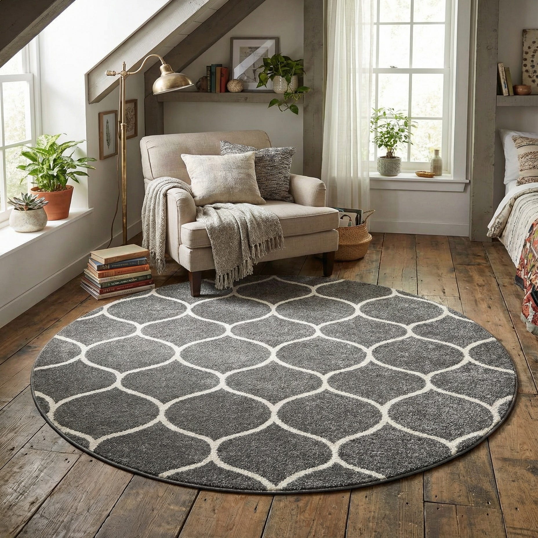 Place it to anchor a seating area, a breakfast nook, or beneath a round dining table where the shape echoes the furniture. Its neutral palette works well with contemporary and transitional schemes—pair it with light wood tones and cool metal accents for a modern look, or layer it with textured throws and warm neutrals for a cozier feel. The dark gray ground grounds the room while the ivory pattern adds contrast and visual lift.