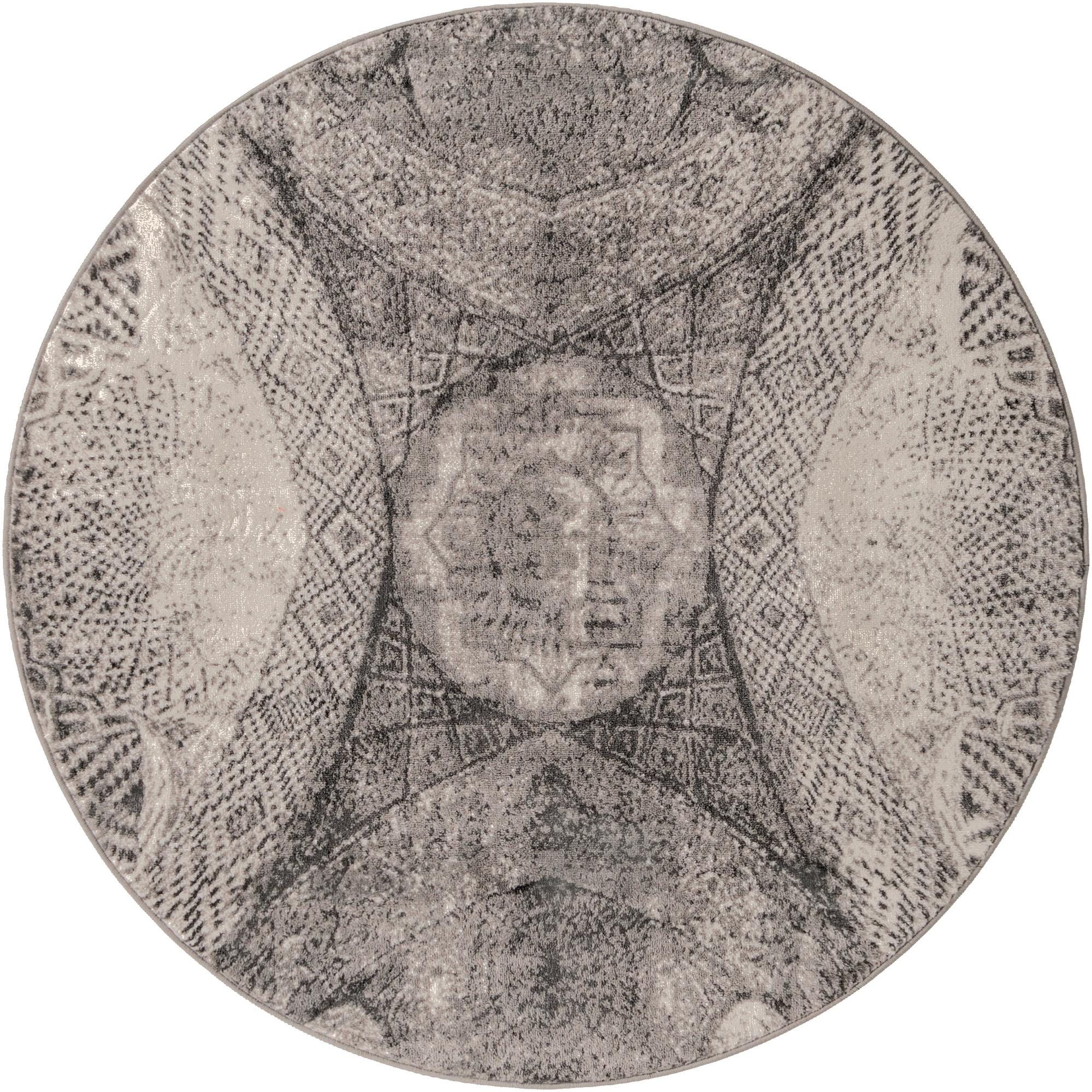 A round, 5' 3" gray and silver bohemian medallion rug with a distressed, vintage-inspired pattern.