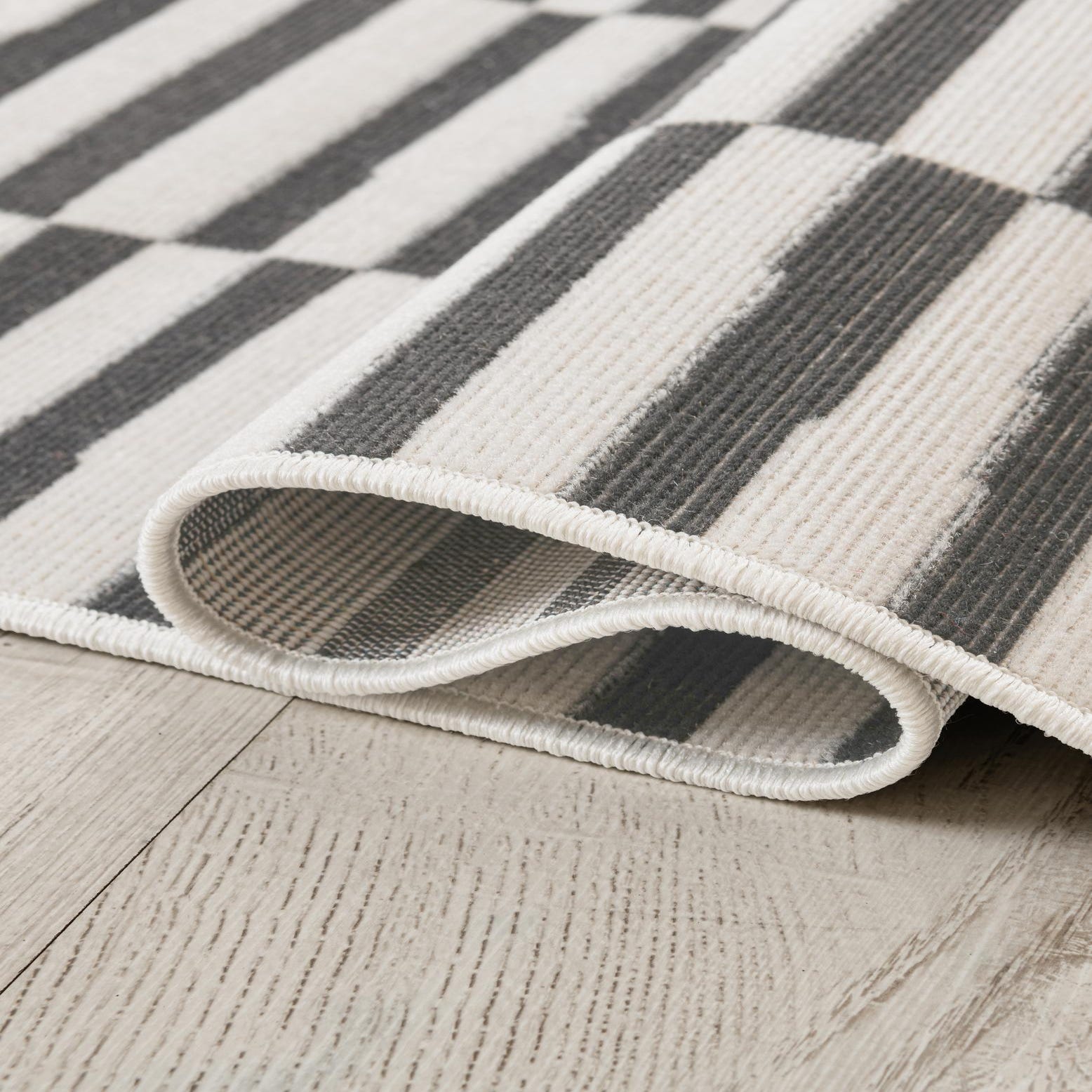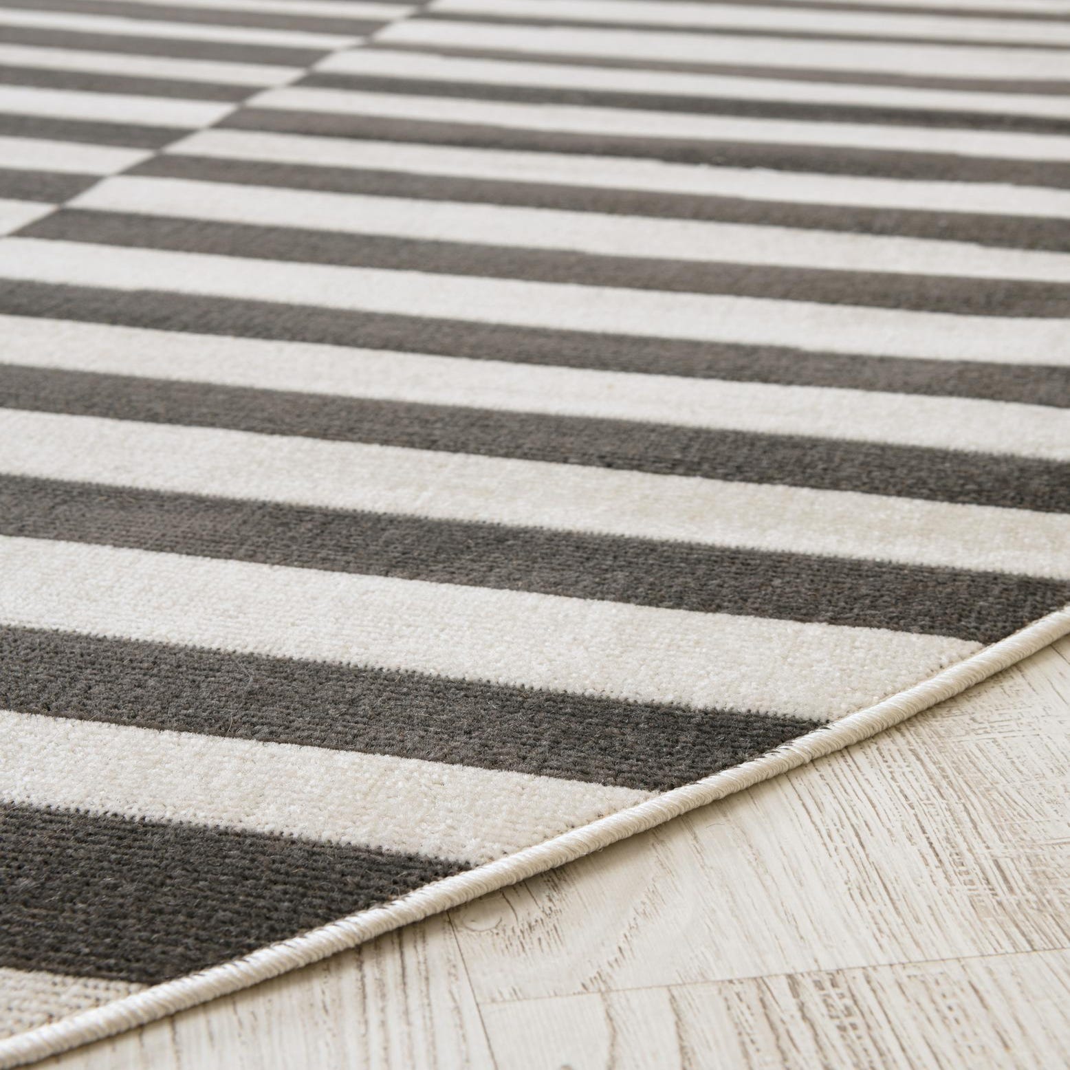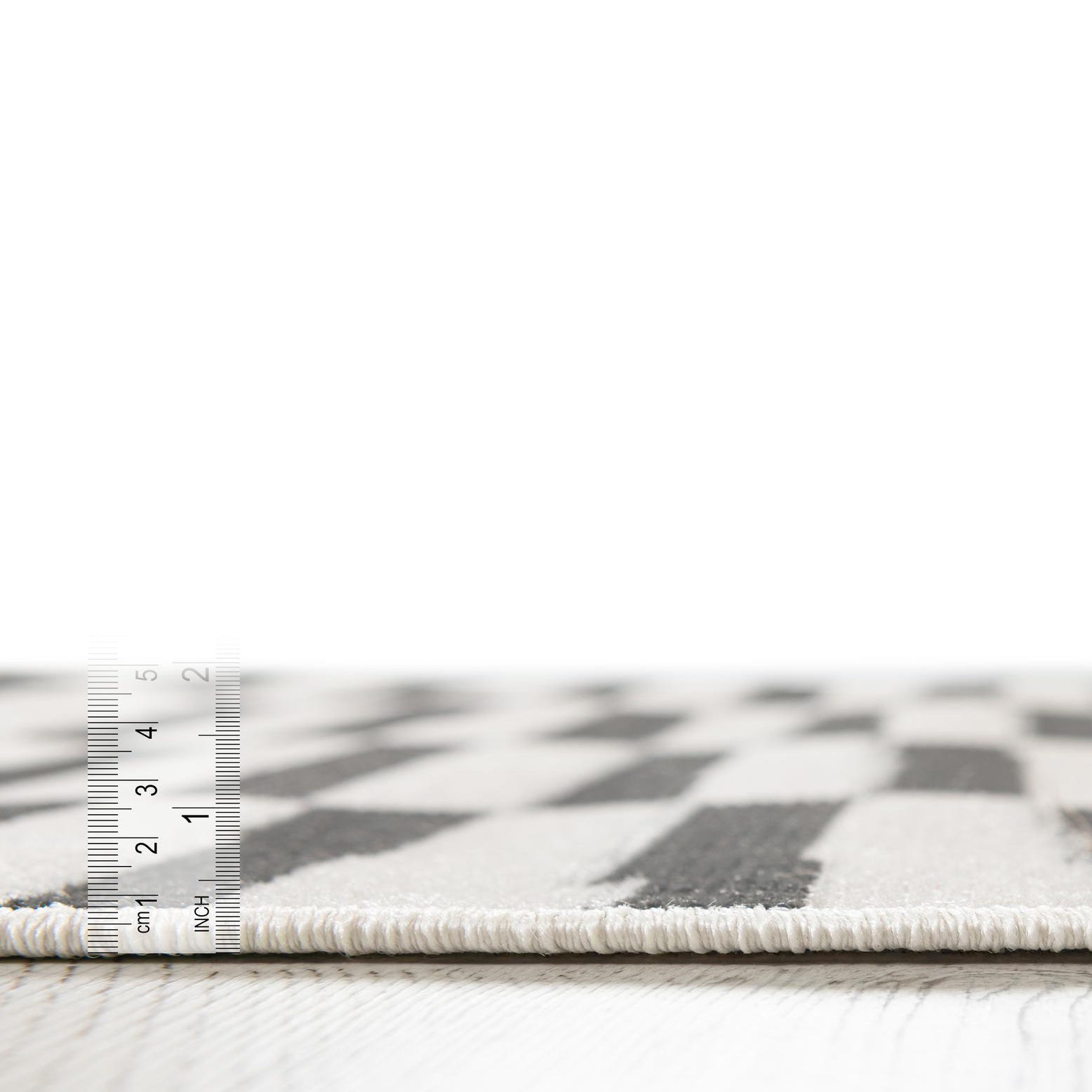 We bought 2 of these - one fr our living room and one for the kitchen - since the rooms are open and have the same color scheme. Pay attention to the pile height - it is pretty flat and not as plush as the other low pile rugs we ordered. And because of that it is taking a while to lay completely flat. The larger size flattened out quicker than the smaller size and we can still see some ripples and the corners still stick up. Color is gorgeous though (we got the teal) and size is accurate.