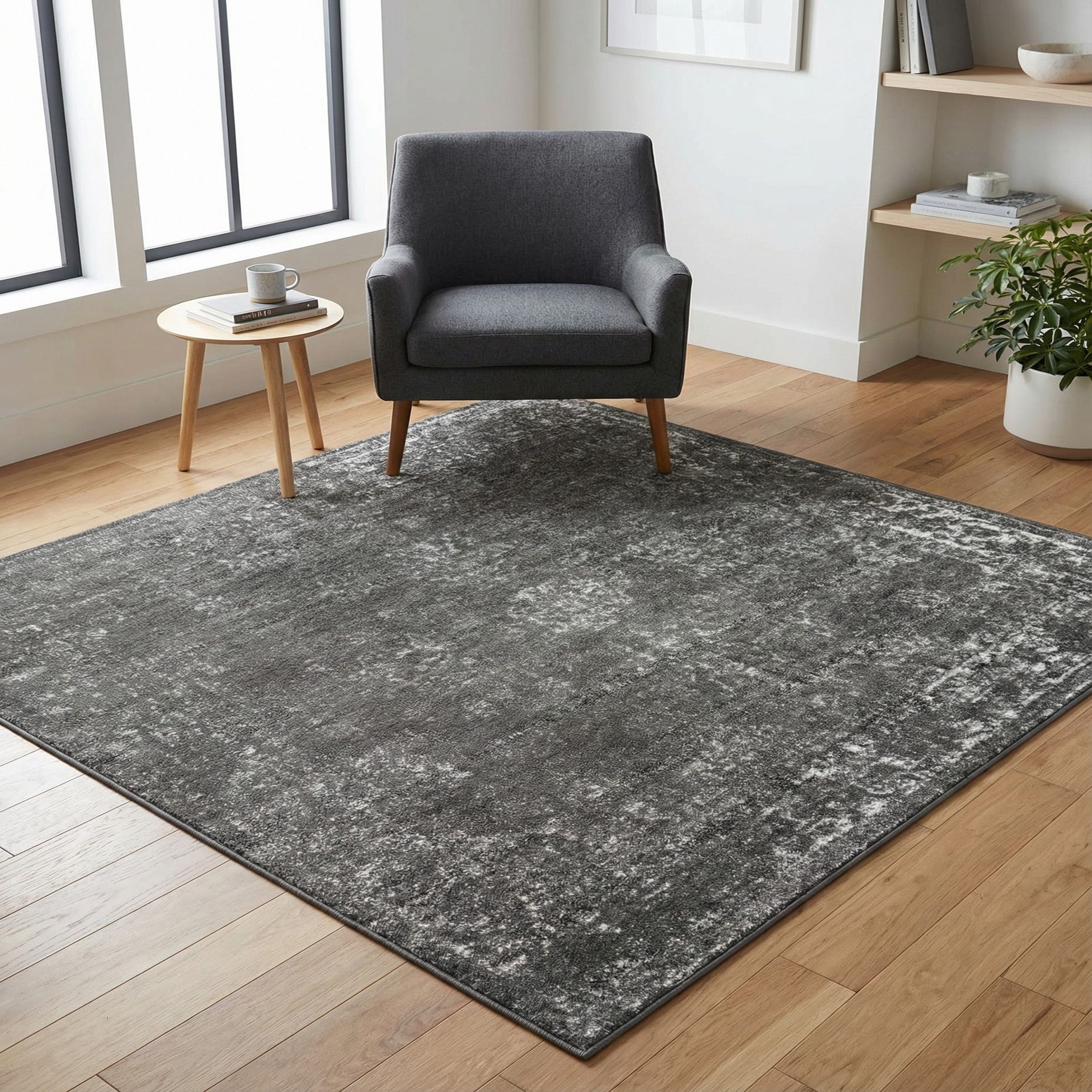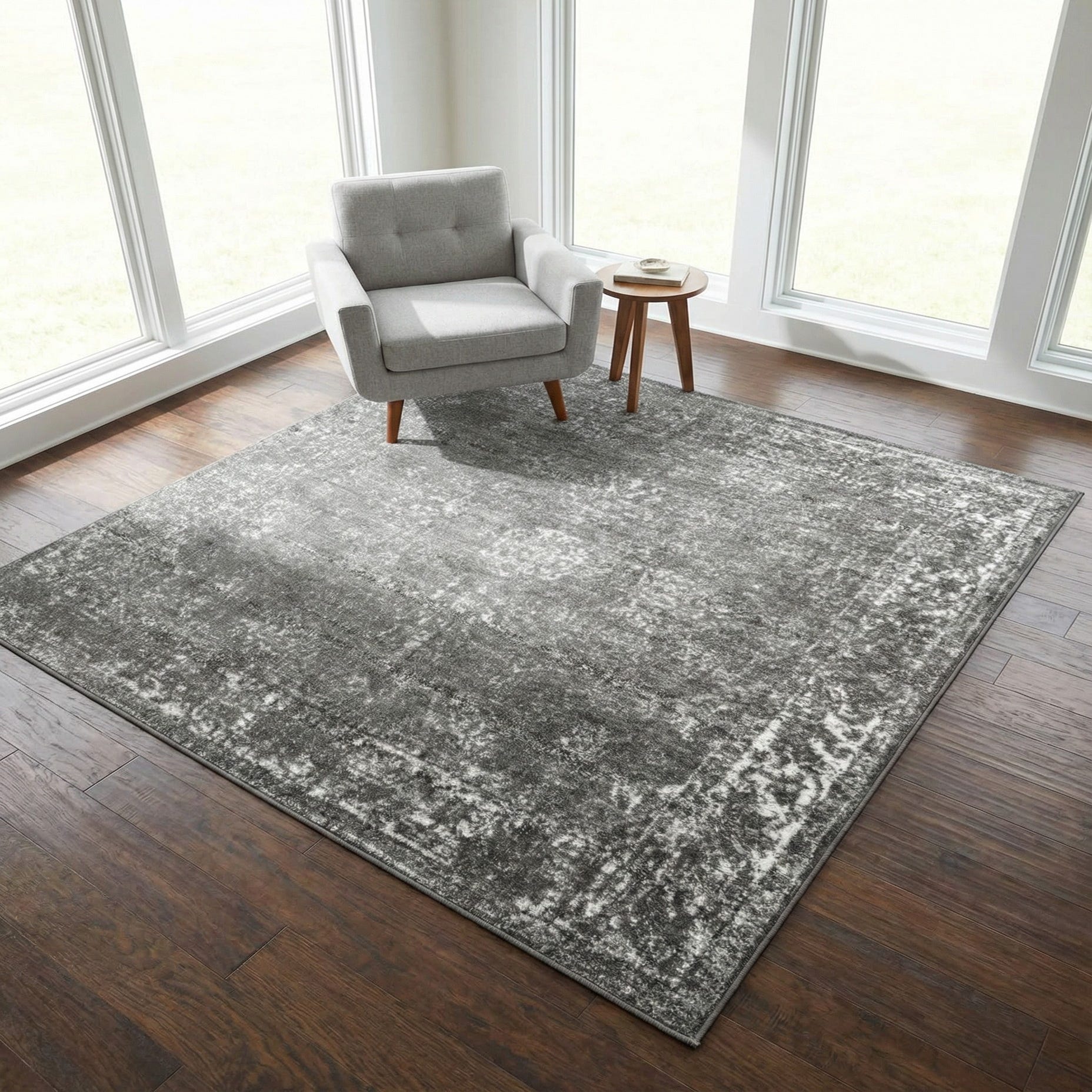 A softly distressed motif gives this square rug a lived-in, vintage-inspired look: a predominantly dark gray field with irregular beige highlights that form the hint of a faded central medallion and a worn border. The pattern reads as both modern and transitional, with the muted contrast between the dark gray background and the beige accents creating depth without overpowering a room.