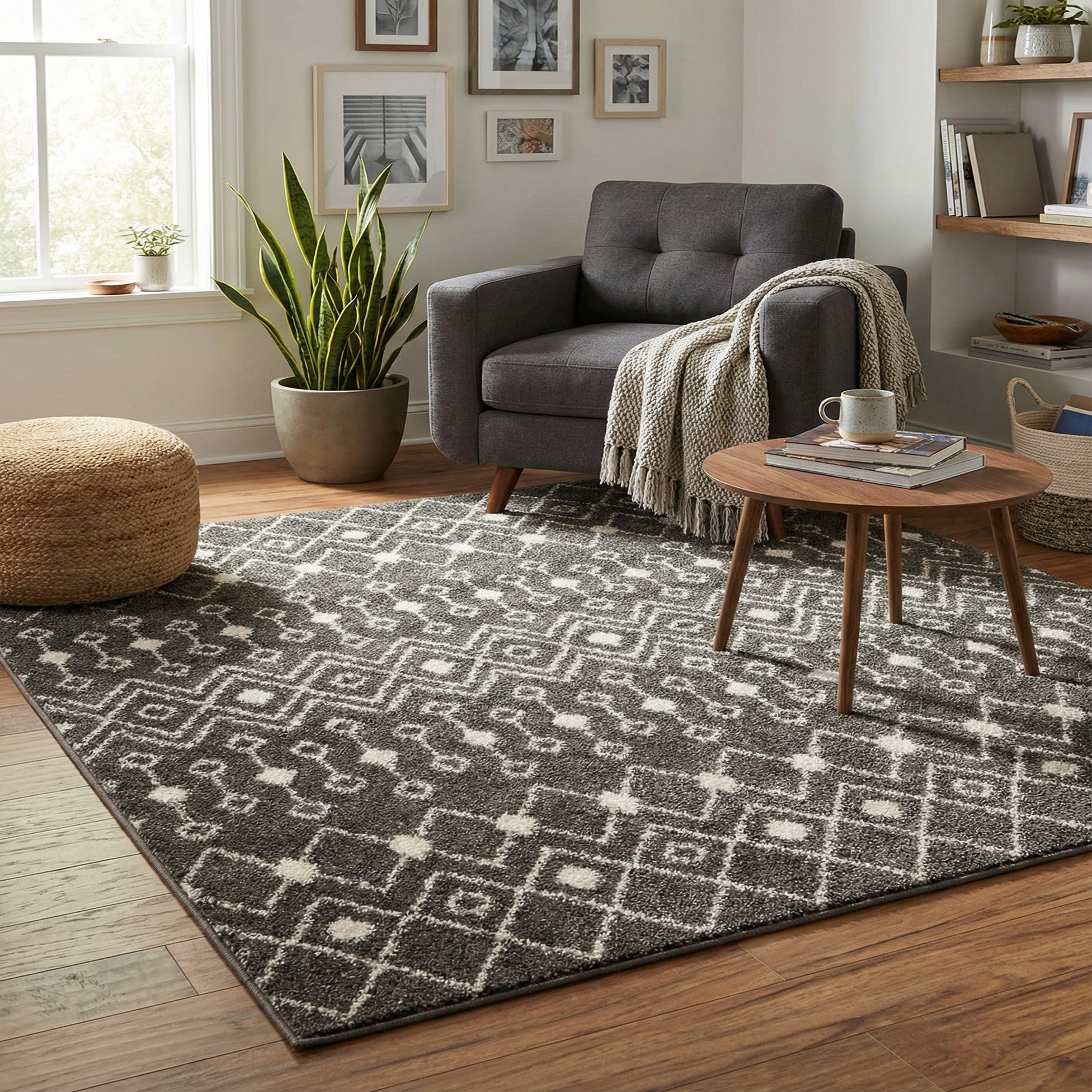 The dark gray and ivory color scheme allows this rug to anchor spaces with a neutral yet sophisticated palette. It works seamlessly with contemporary, minimalist, and Scandinavian interiors, providing a subtle statement piece. The clean lines and distinctive geometric pattern also make it an appropriate choice for modern industrial and urban loft design scenarios, lending a touch of warmth and texture without overpowering the space.