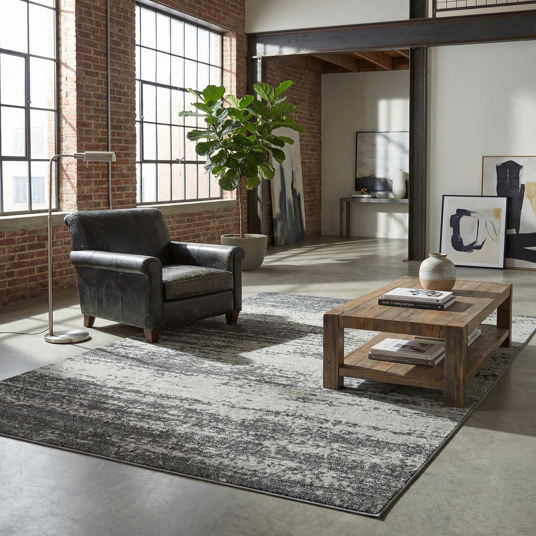A moody, modern rug with a softly distressed abstract pattern in layered tones of Dark Gray, Gray and Black. The Dark Gray field is punctuated by horizontal striations and weathered marks that add depth and movement without overwhelming the space. The low-profile pile has a dense, smooth hand—when you run your fingers across it you feel a subtle, even nap that lies flat and comfortable underfoot.