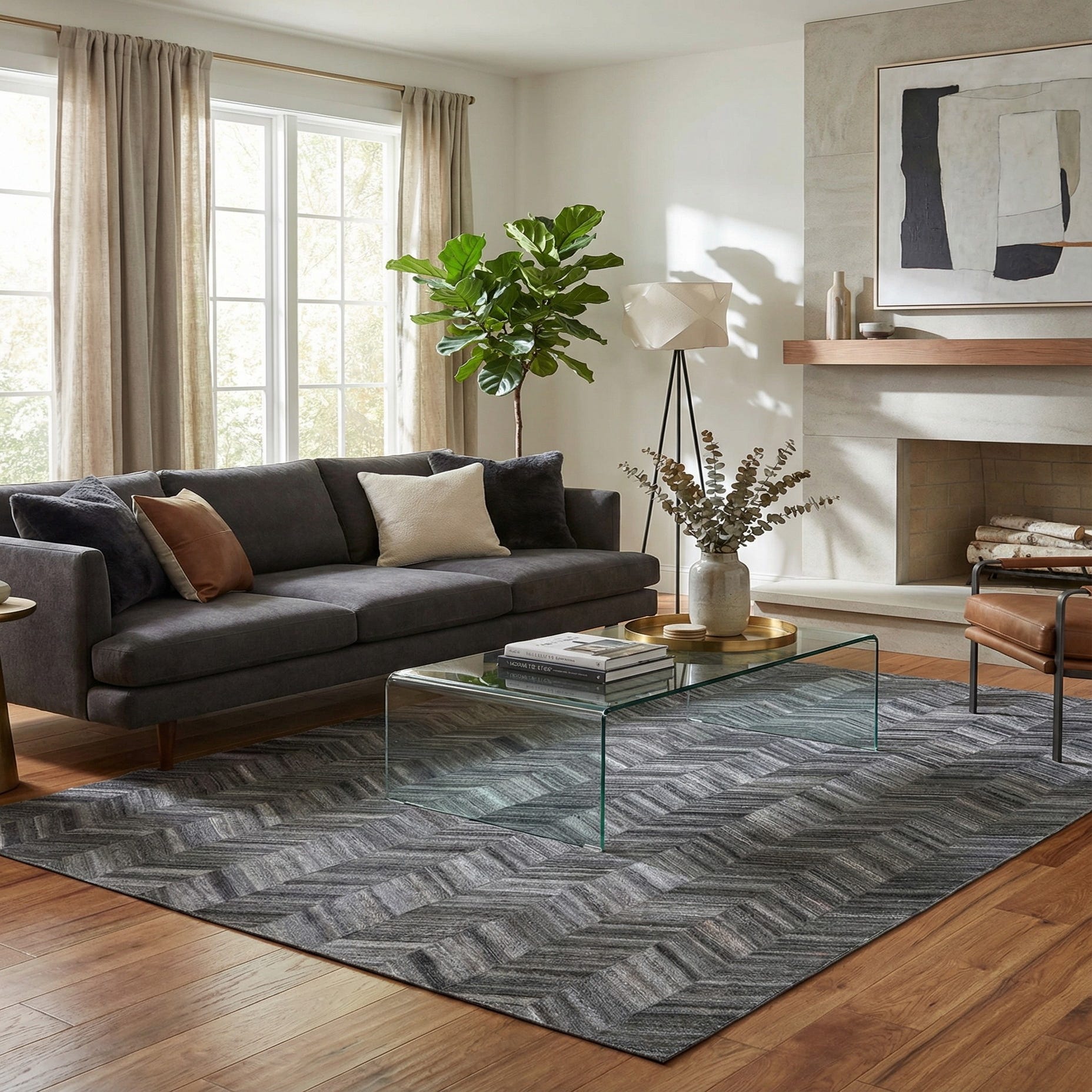 A 5x8 rectangular gray cowhide rug featuring a modern chevron pattern, ideal for a living room.