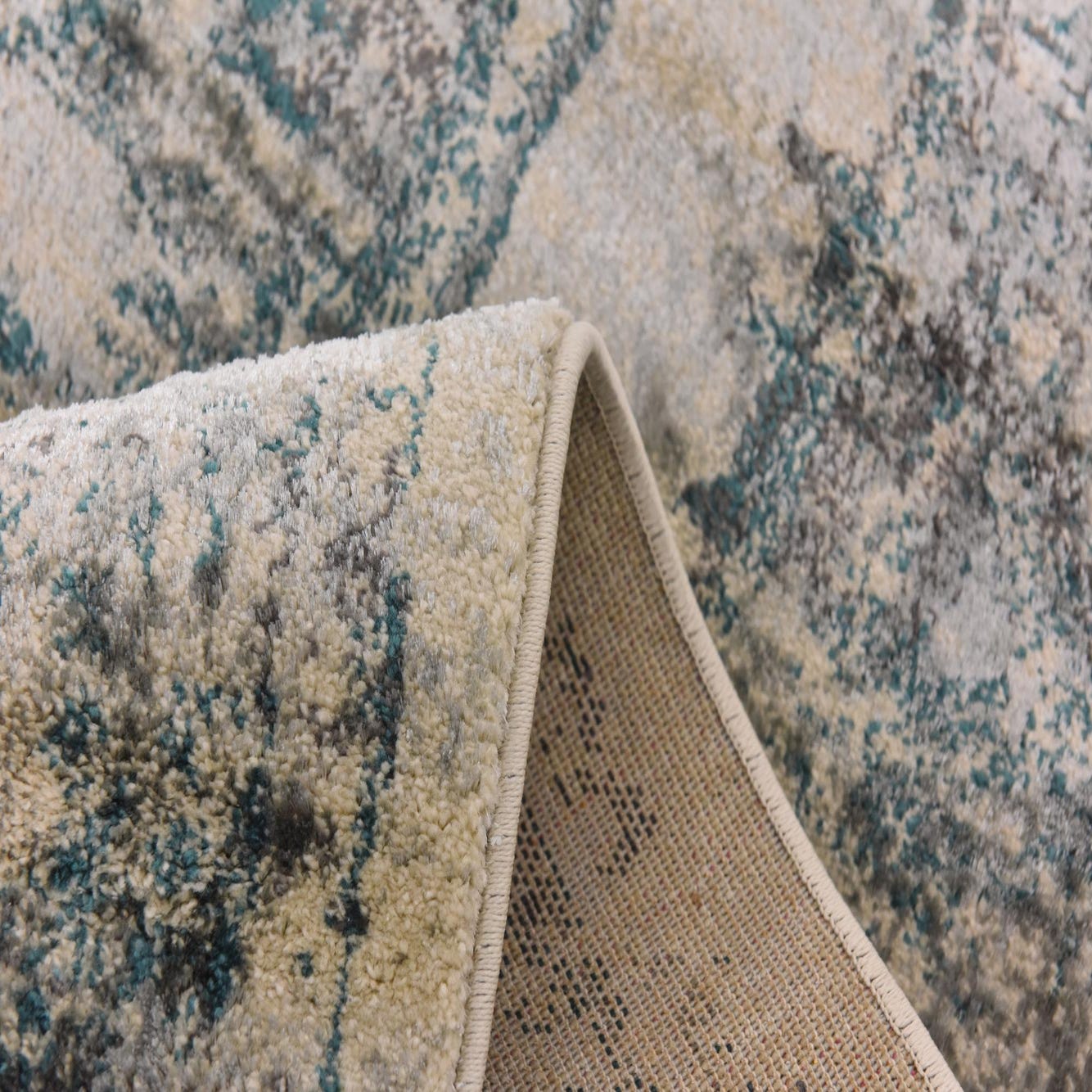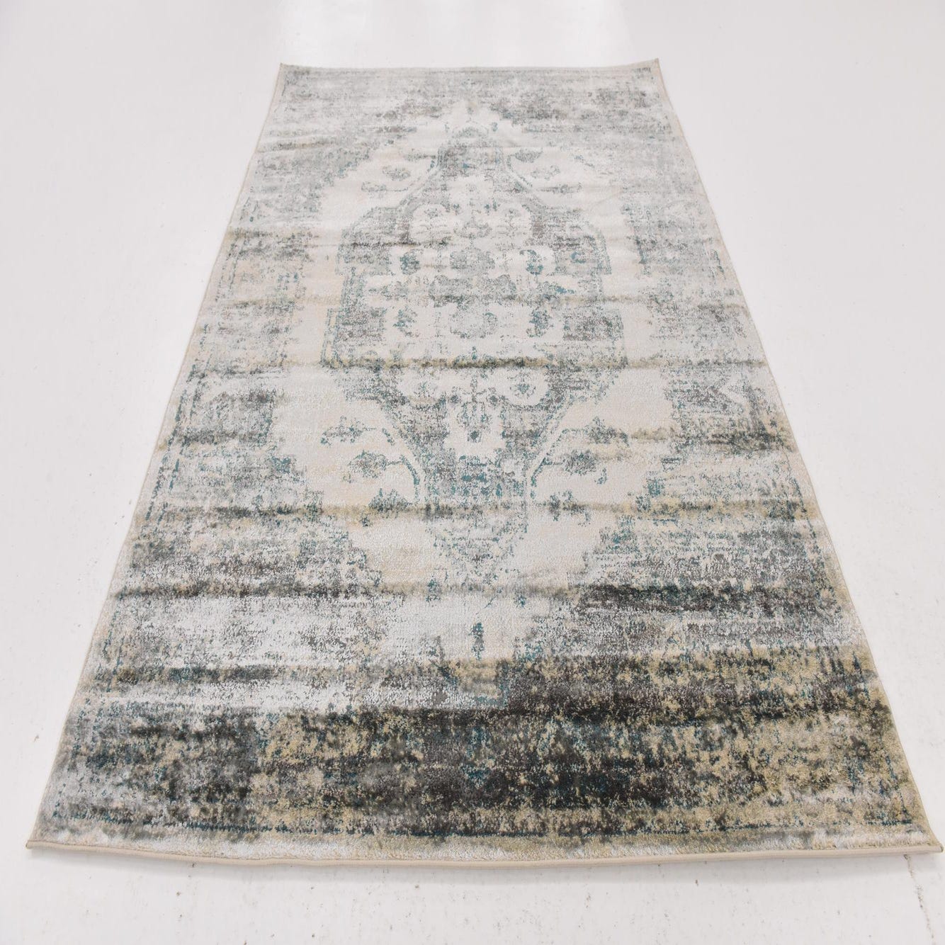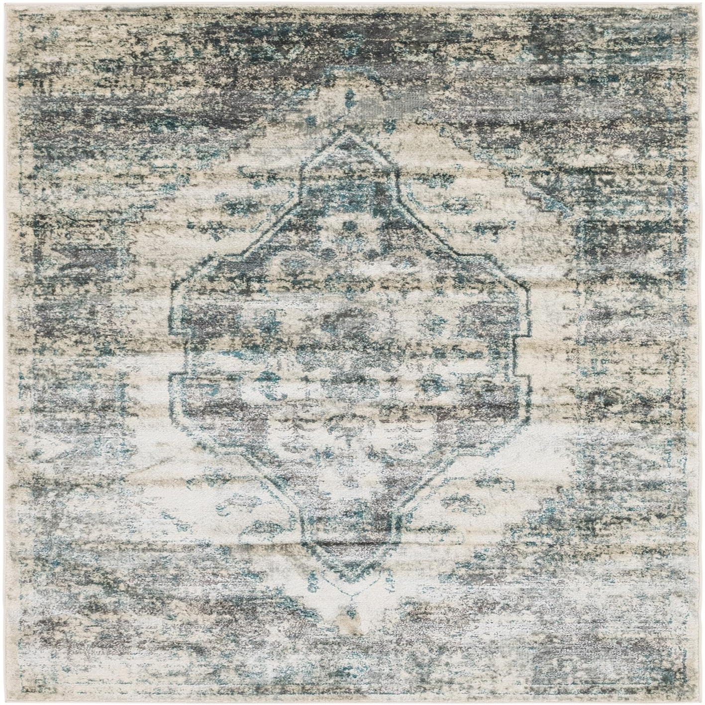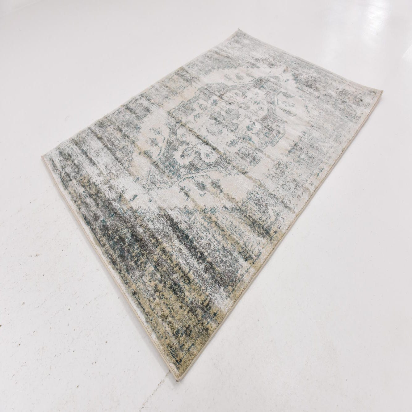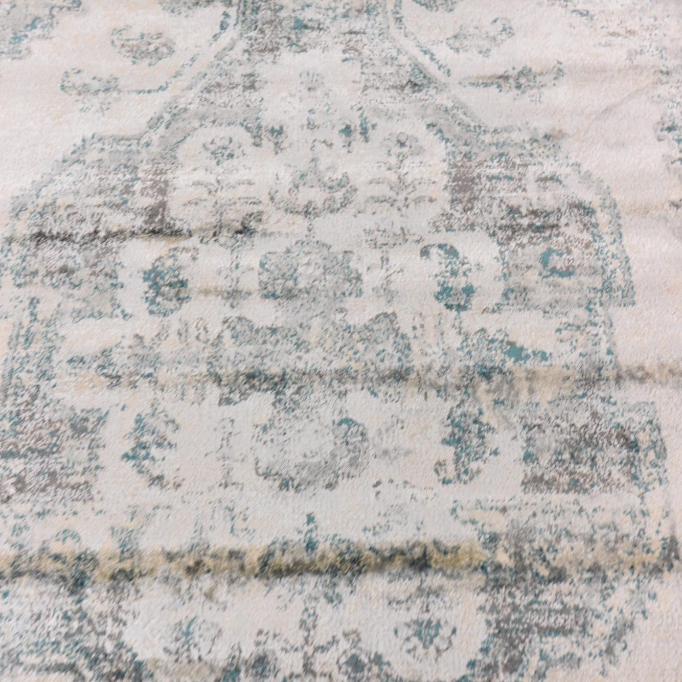 The Fleur collection offers a versatile 5x8 rug machine woven of 100% polypropylene, known for its durability. This piece boasts a dark gray background complemented by a pattern highlighting tones of cream, gray, teal, and tan. The design features a central medallion surrounded by intricate detailing and a distressed look for a contemporary twist on classic motifs.
