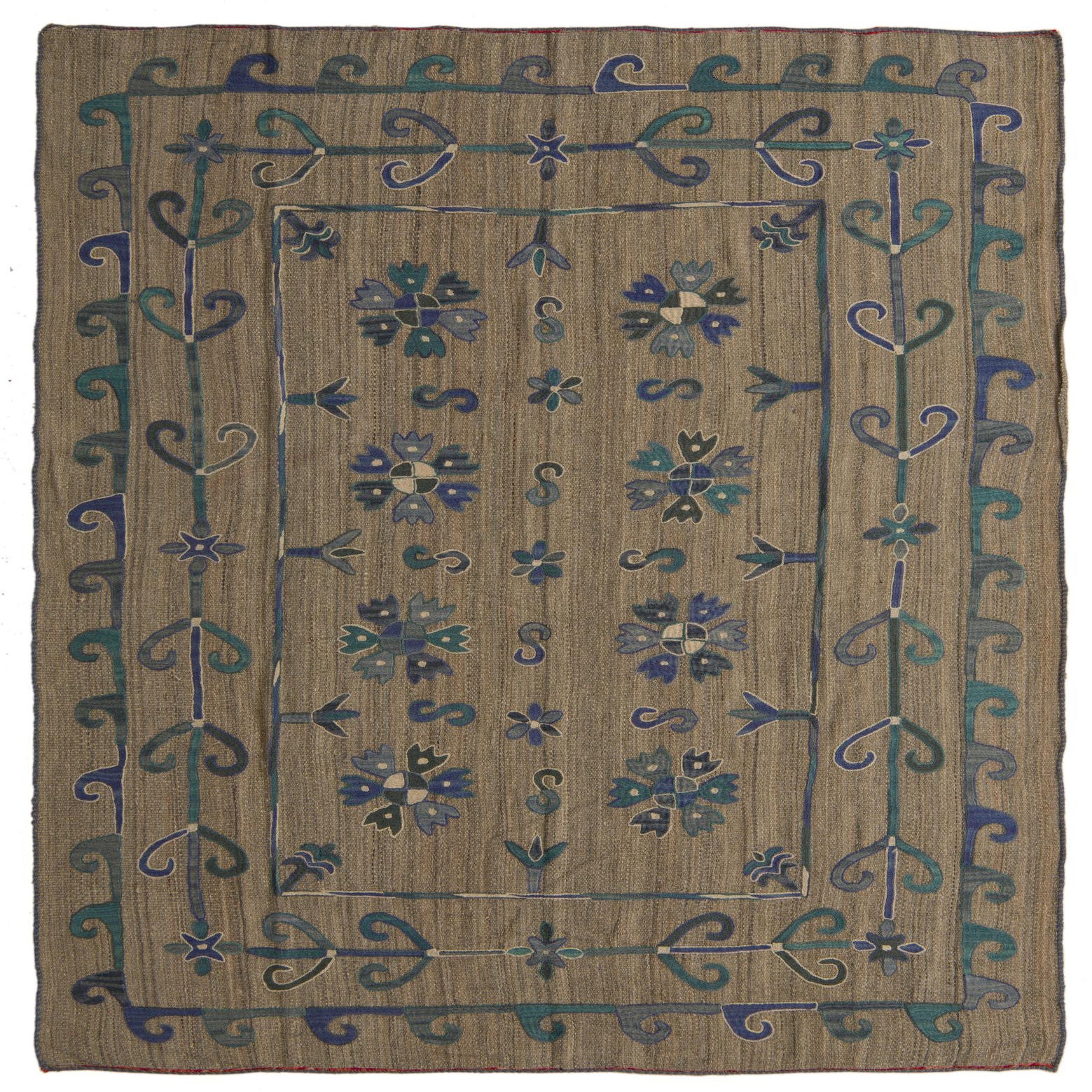 A 5x8 rectangular gray flatweave wool rug with a tribal Suzani pattern in shades of blue and teal.