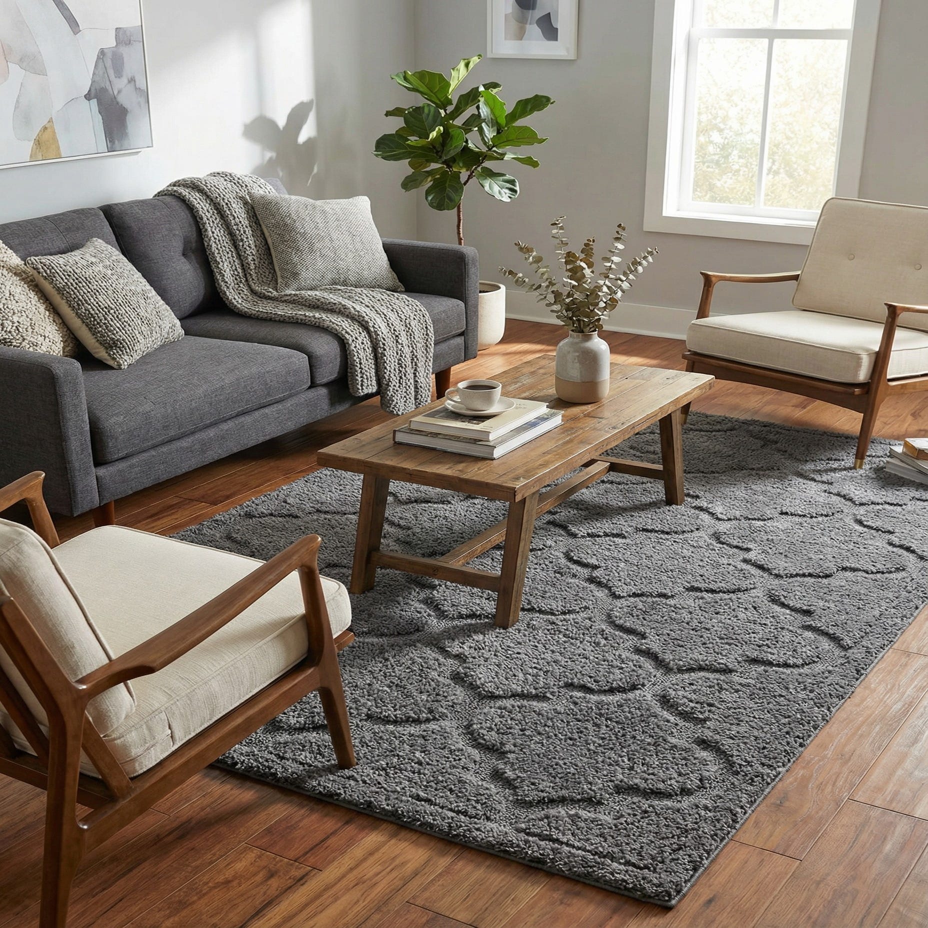 A plush, high-pile shag with a dark gray background and a subtle, tone-on-tone lattice motif. The raised quatrefoil pattern is rendered in a slightly lighter gray, giving the surface soft dimensionality without strong contrast. Machine-made of 100% polypropylene, the dense pile feels cushioned underfoot and has a soft, tactile texture that invites bare feet and relaxed use.