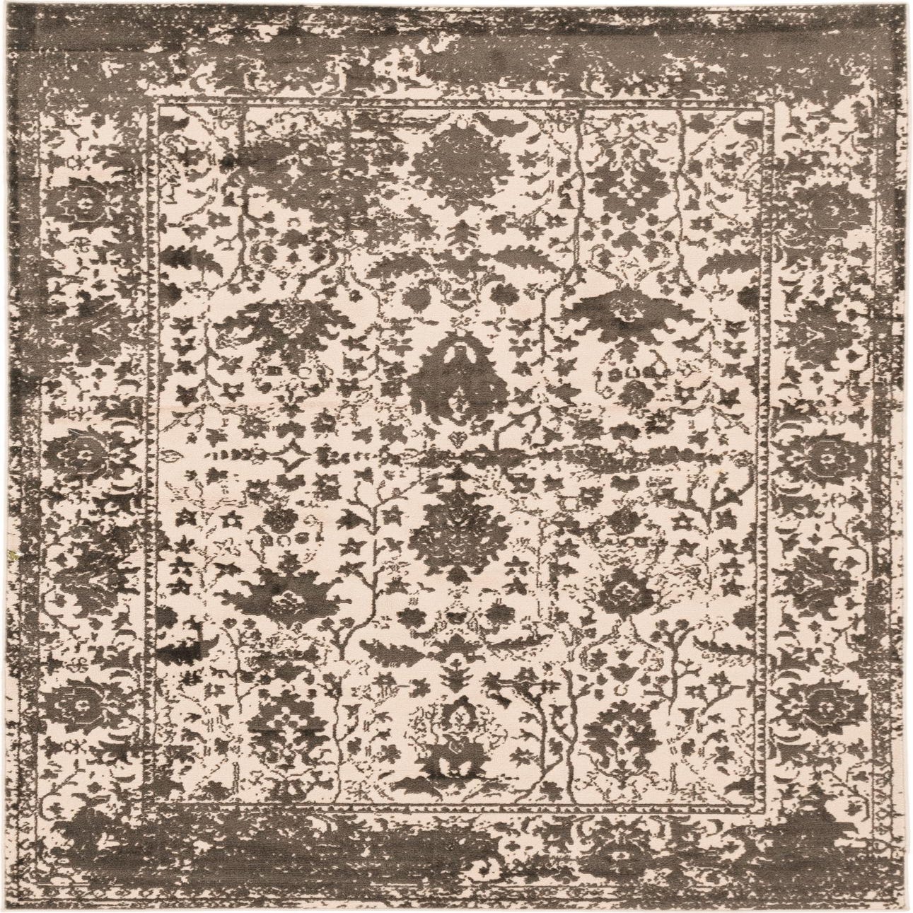 A 5x8 rectangular Modern Classical rug featuring a distressed traditional pattern in gray and off-white, ideal for a living room.