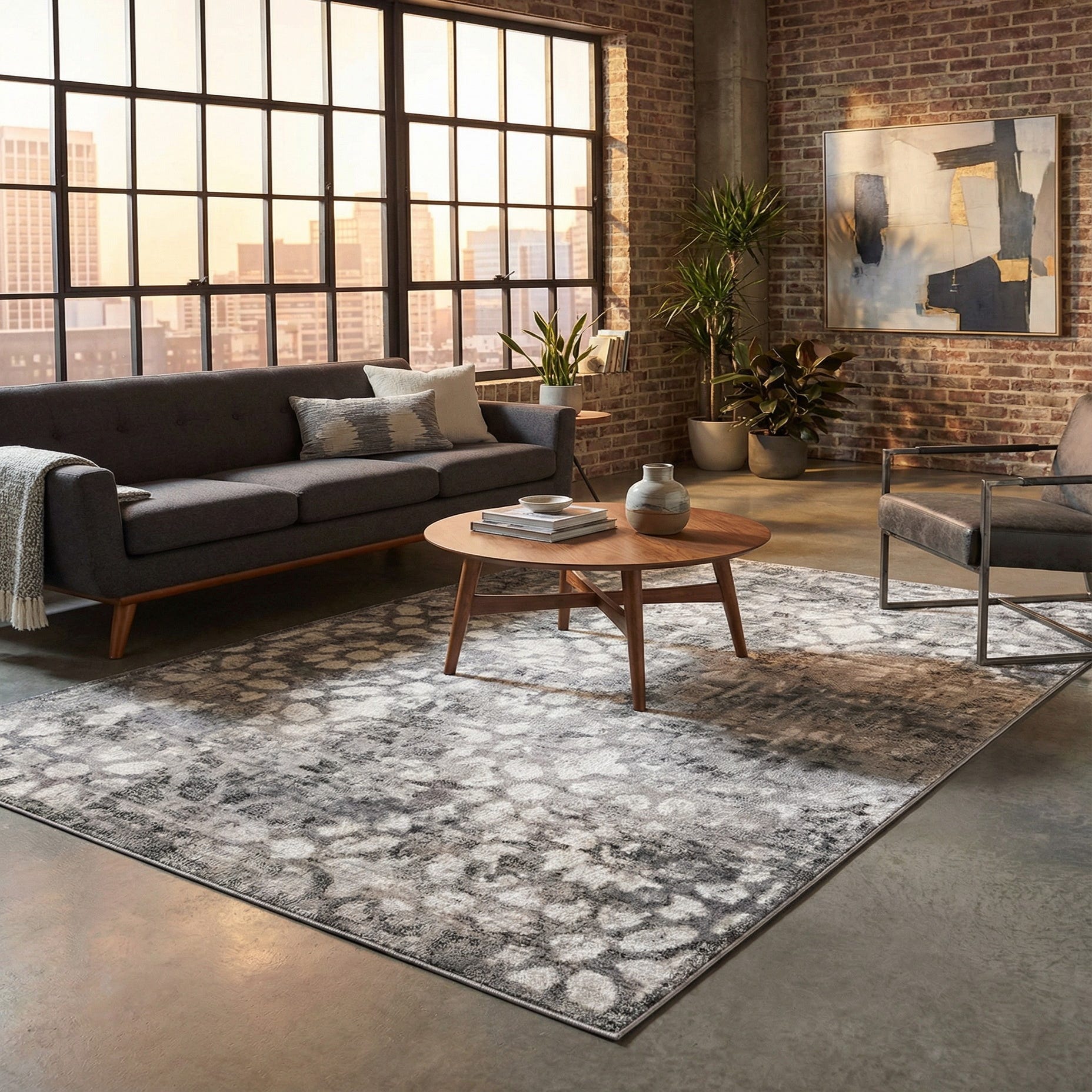 This neutral palette and gently aged pattern work well in contemporary and transitional interiors. Place it under a low-profile sofa and coffee table to anchor a living room, or use it to add layered texture beneath a bed in a calm, monochromatic bedroom. It pairs nicely with cool-toned leathers, light or medium wood finishes, and metal accents, and can also soften an office or entryway that leans toward modern minimalism.