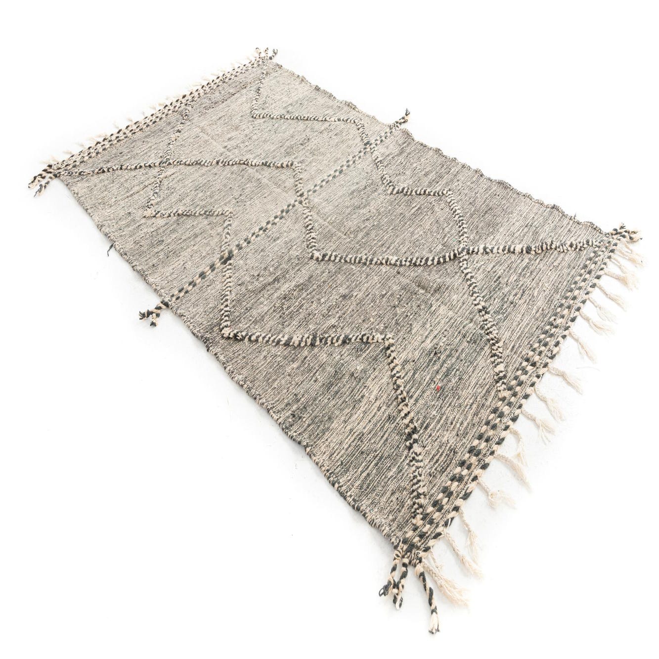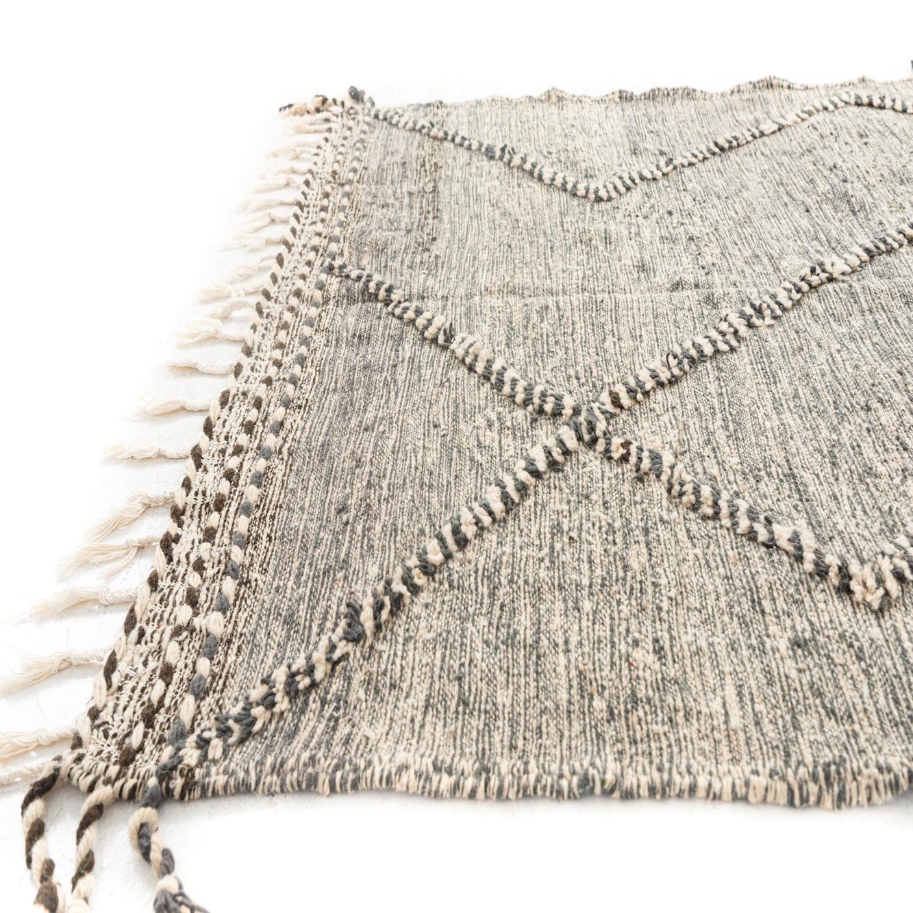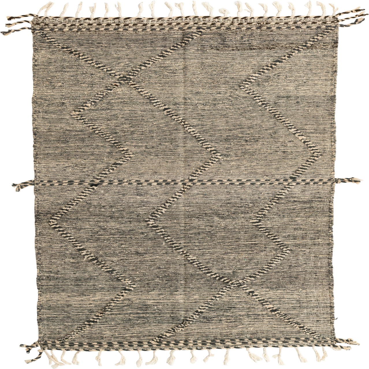 A 5x8 rectangular gray wool shag rug with a modern tribal diamond pattern and white tassels.