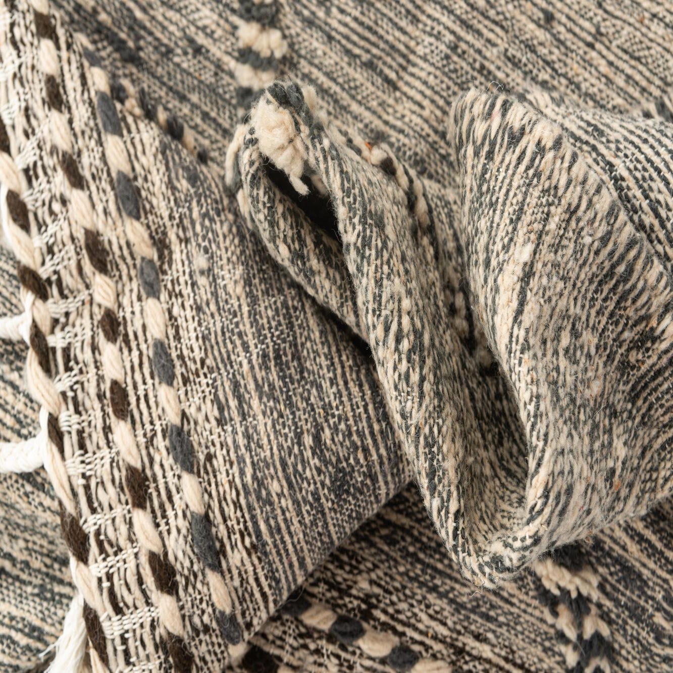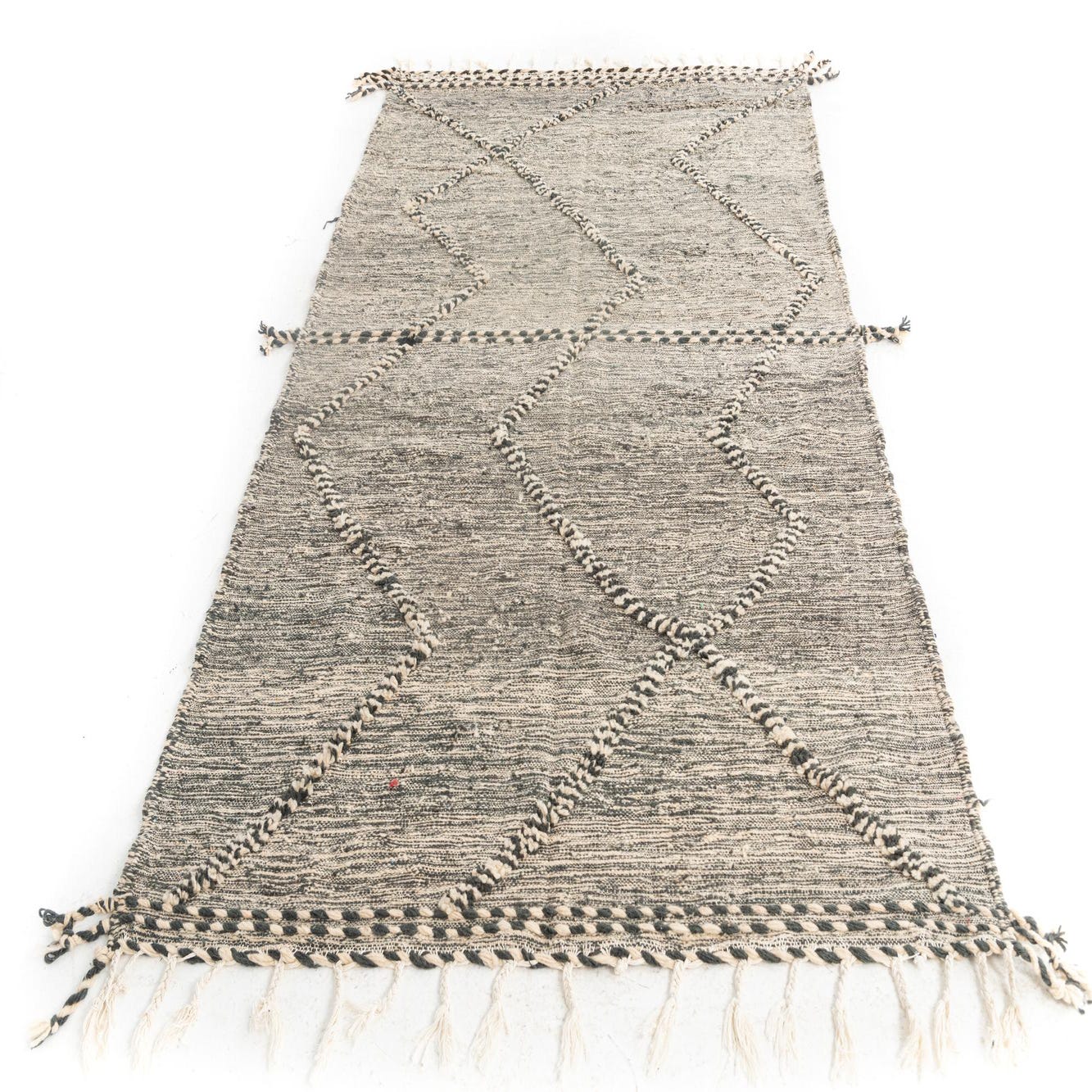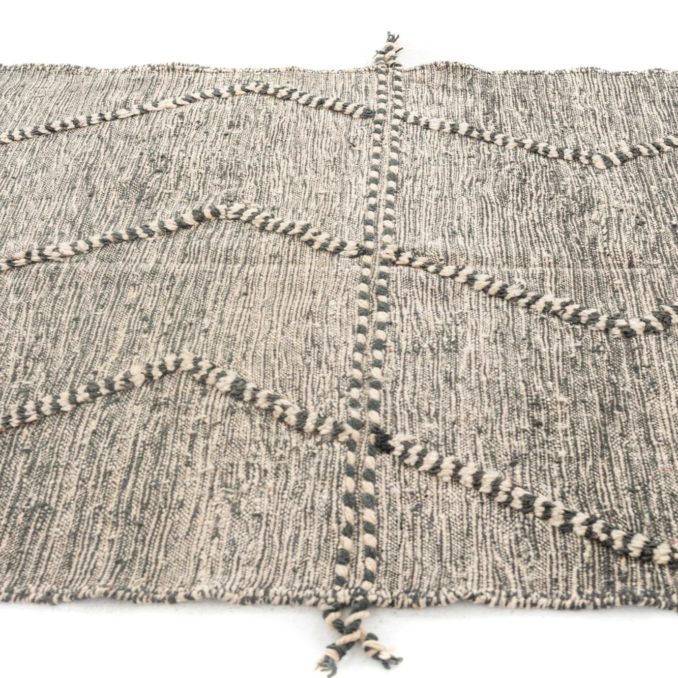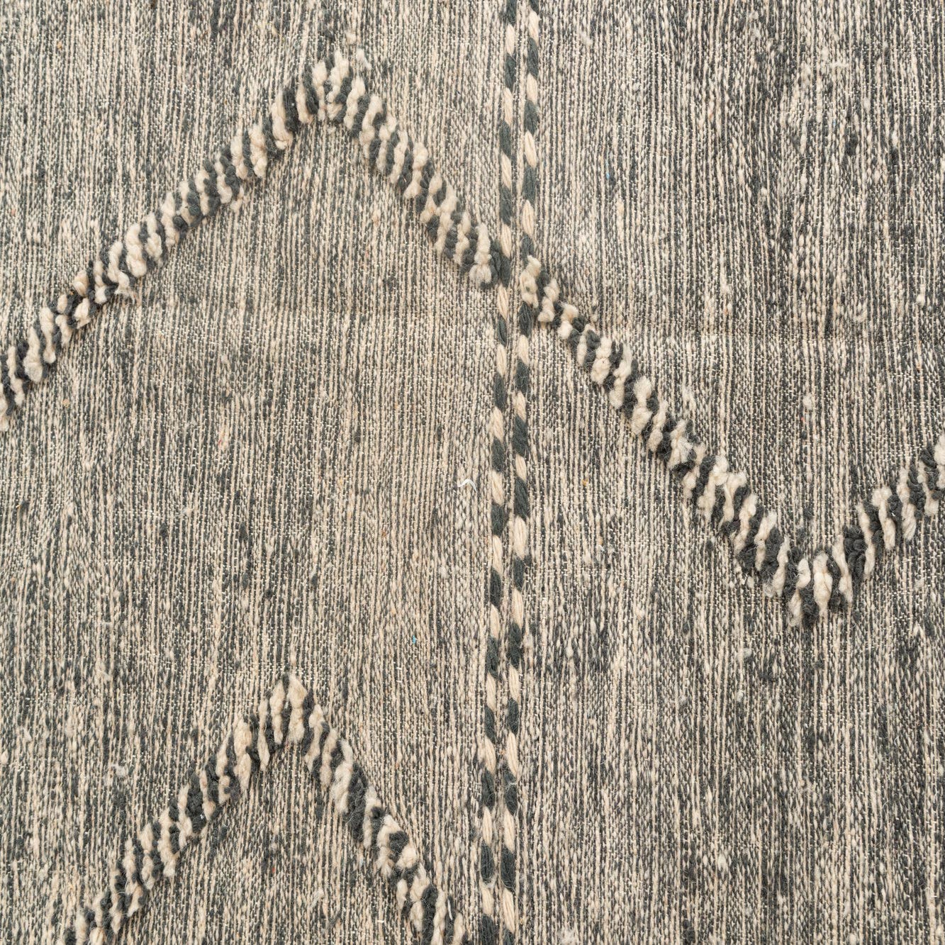 From the Moroccan collection, this hand-knotted rug presents a distinct design with historic charm. Made entirely of 100% wool, its durability is complemented by a soft texture that adds a sense of comfort to any space. The rug's pattern features geometric shapes in an engaging zigzag formation that pays homage to traditional Moroccan motifs. It emphasizes a dark gray background with ivory accents, which together create a subdued yet striking visual contrast.