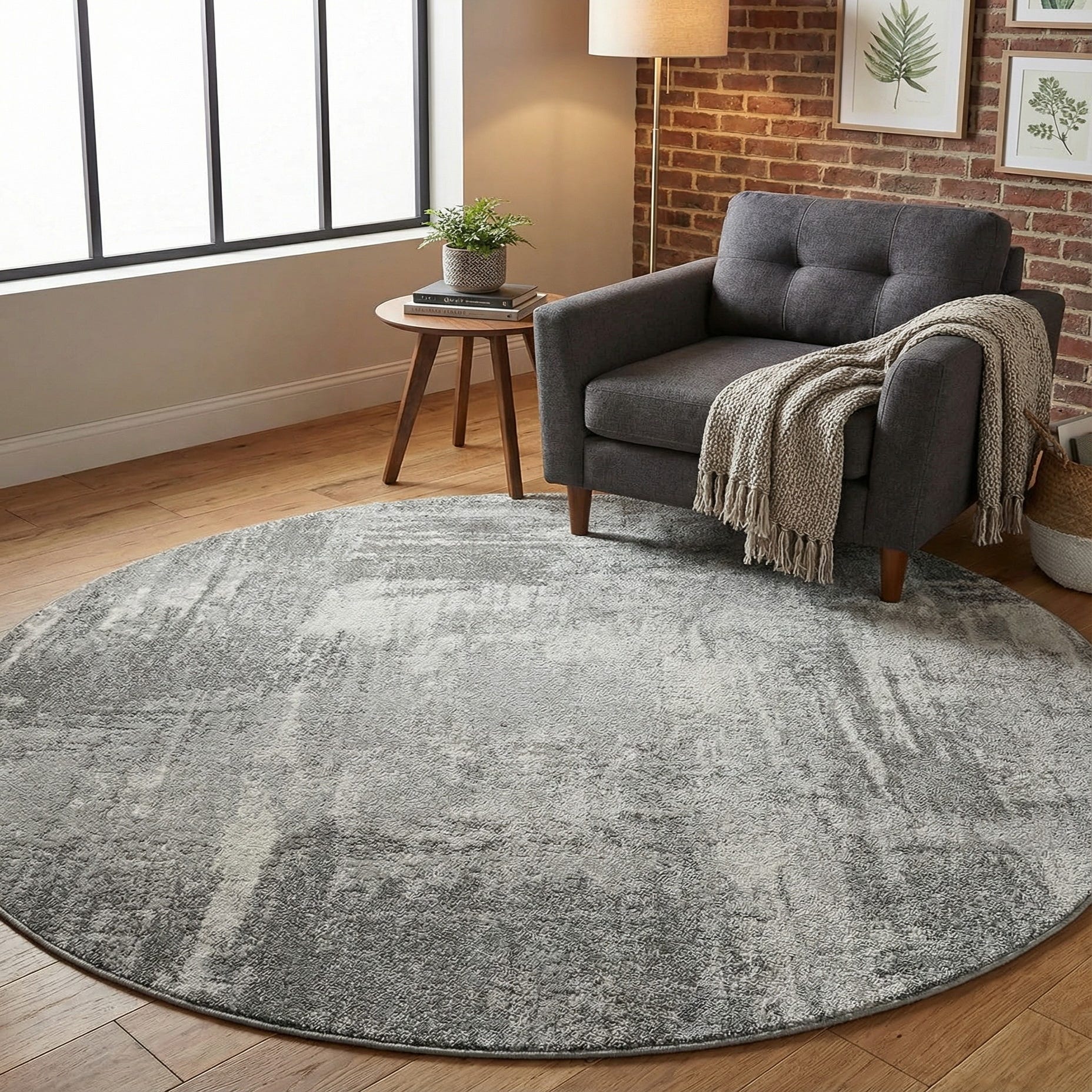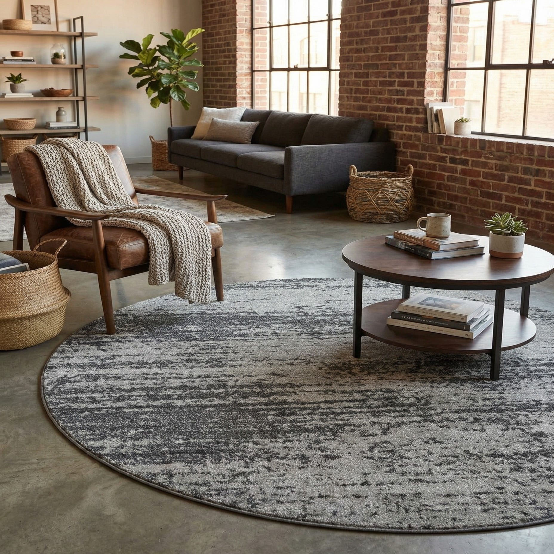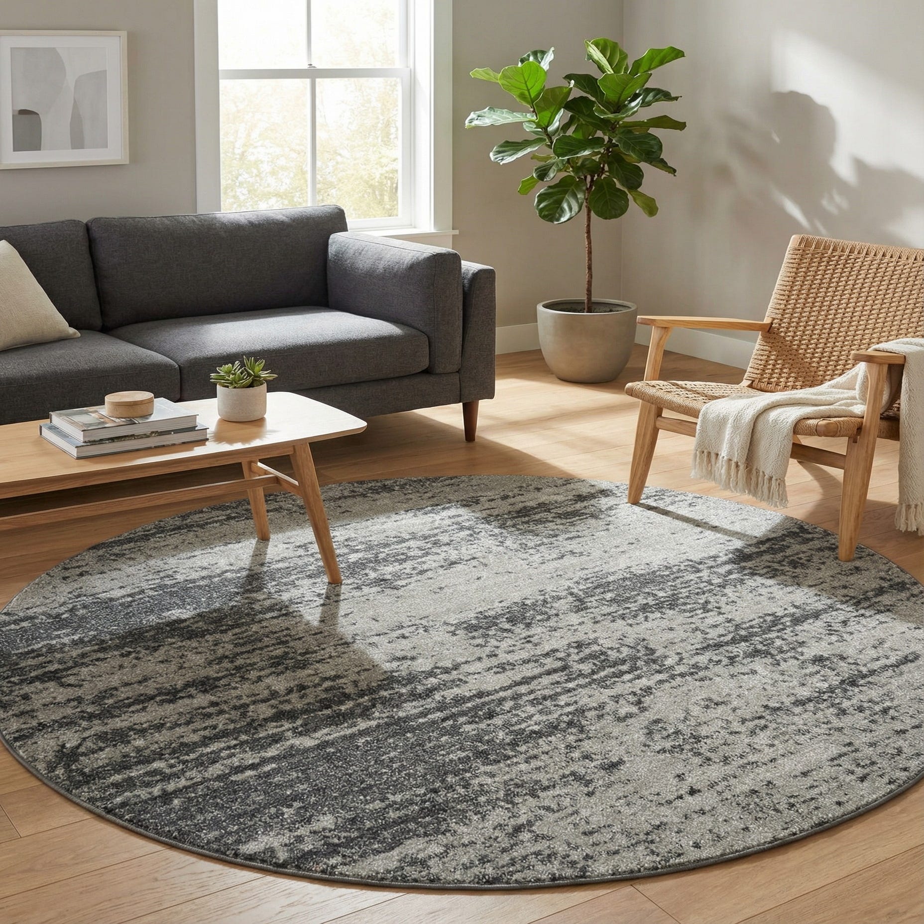 This round rug's abstract pattern makes it a versatile piece for various décor styles, from contemporary to transitional. Its circular shape could effortlessly soften angular spaces or complement the symmetry of round dining tables and central living room seating arrangements. The blend of grays and black allows for integration into color schemes that rely on neutral tones or as a contrast to bolder hues in interior design elements. Suitable for high-traffic areas, this rug could serve as a focal point in a minimalist setting or as a balanced accent in a more eclectic space.