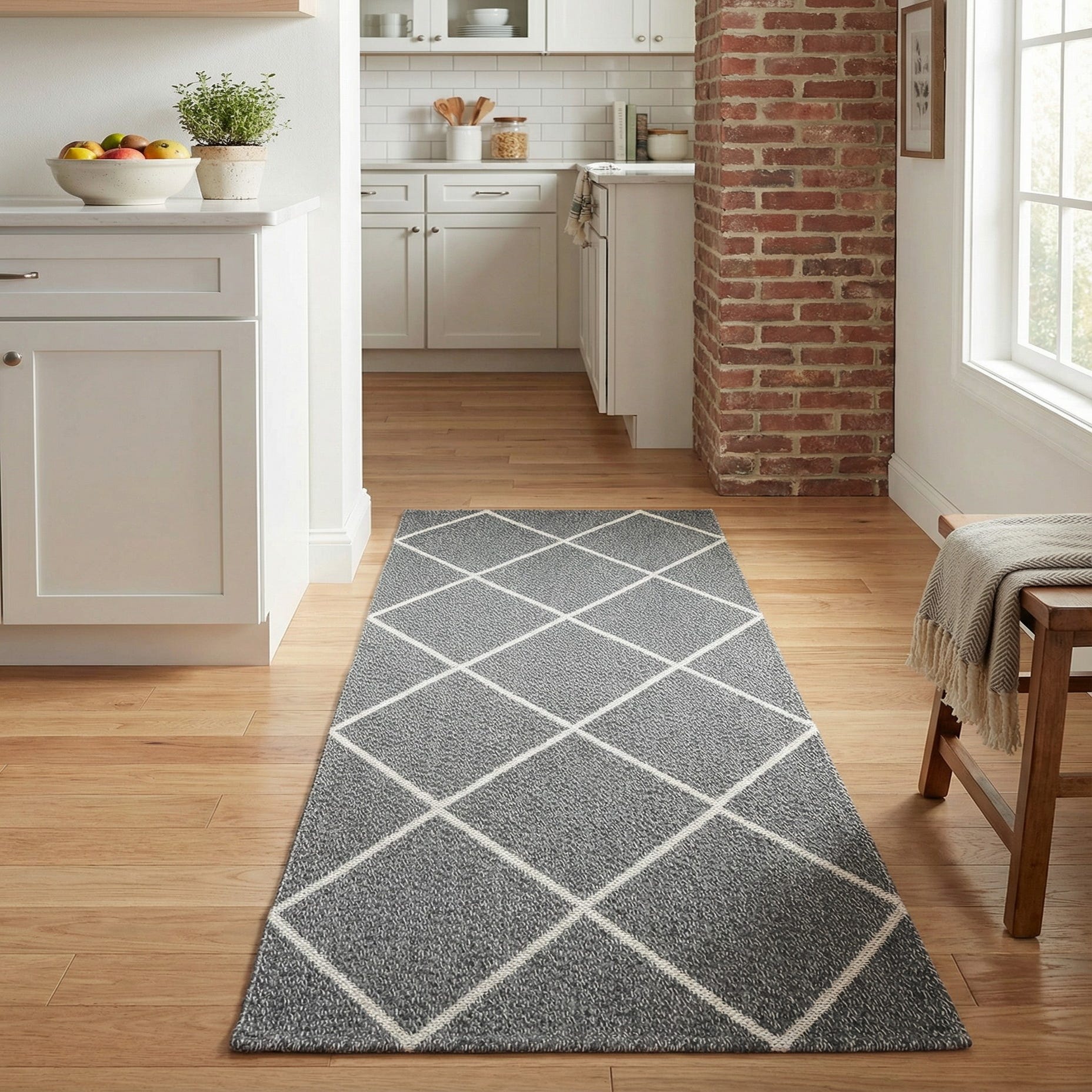 This runner works well in narrow spaces where you want pattern without heavy visual weight — think entryways, hallways, kitchens, or alongside a bed. It pairs naturally with light or medium wood floors, white or neutral trim, and streamlined furnishings for modern, Scandinavian, or transitional interiors. Layer it in front of a console or use it to define a circulation path; the neutral palette and geometric rhythm make it easy to coordinate with both textured linens and simple, solid upholstery.