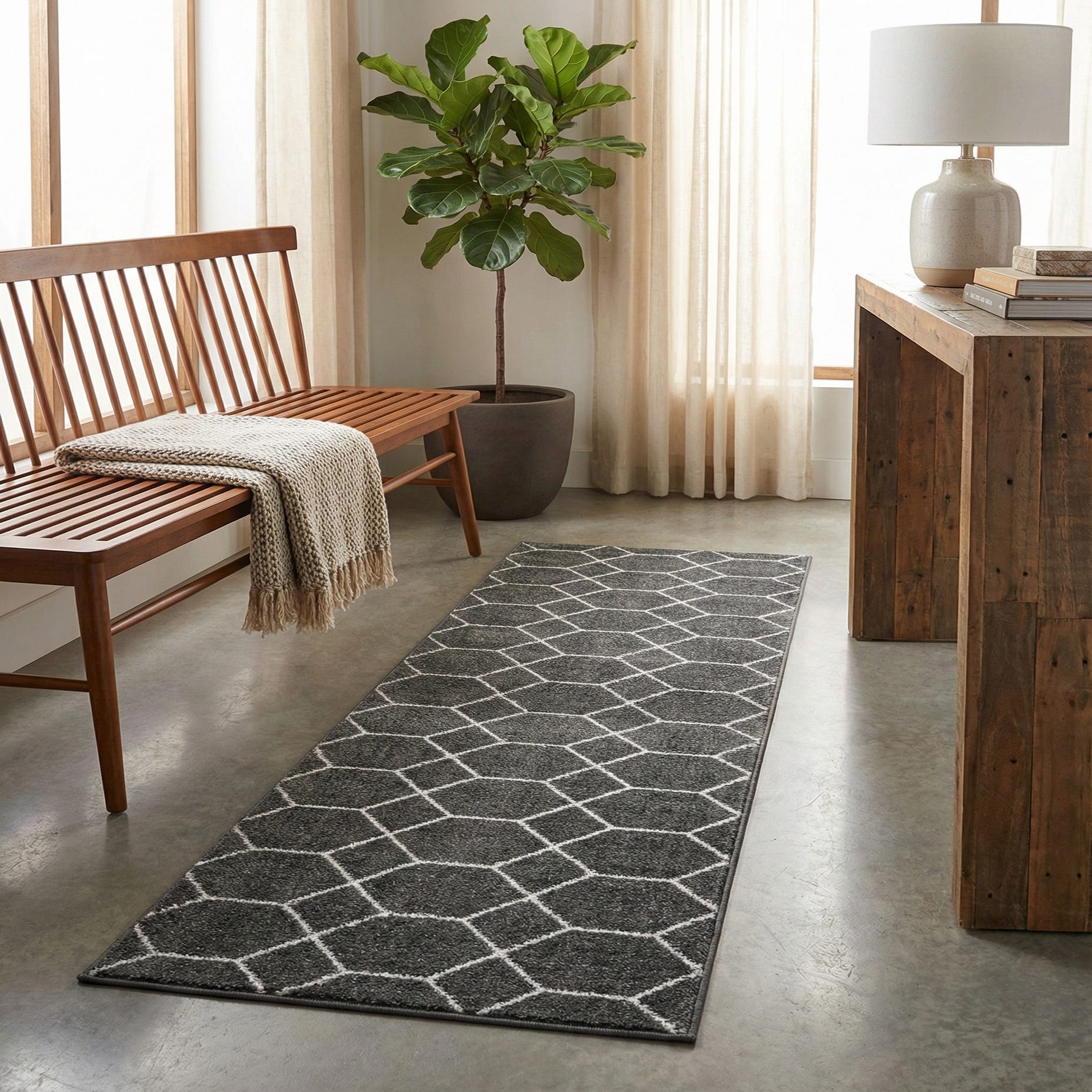 This runner works well in long, narrow spaces such as hallways, entryways, or alongside a kitchen island, and it pairs naturally with modern, transitional, or industrial-inspired interiors. Use it to anchor a console and lamp in an entry, to add structure to a monochrome living area, or to balance warm wood tones in a contemporary bedroom; the dark gray and ivory palette complements cool metal finishes and light natural woods alike.