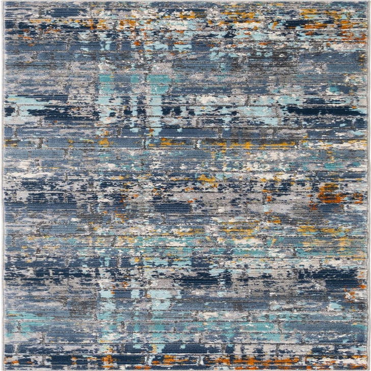 A 6 ft runner rug with an abstract, urban pattern in shades of gray, silver, navy blue, teal, and hints of orange and yellow.