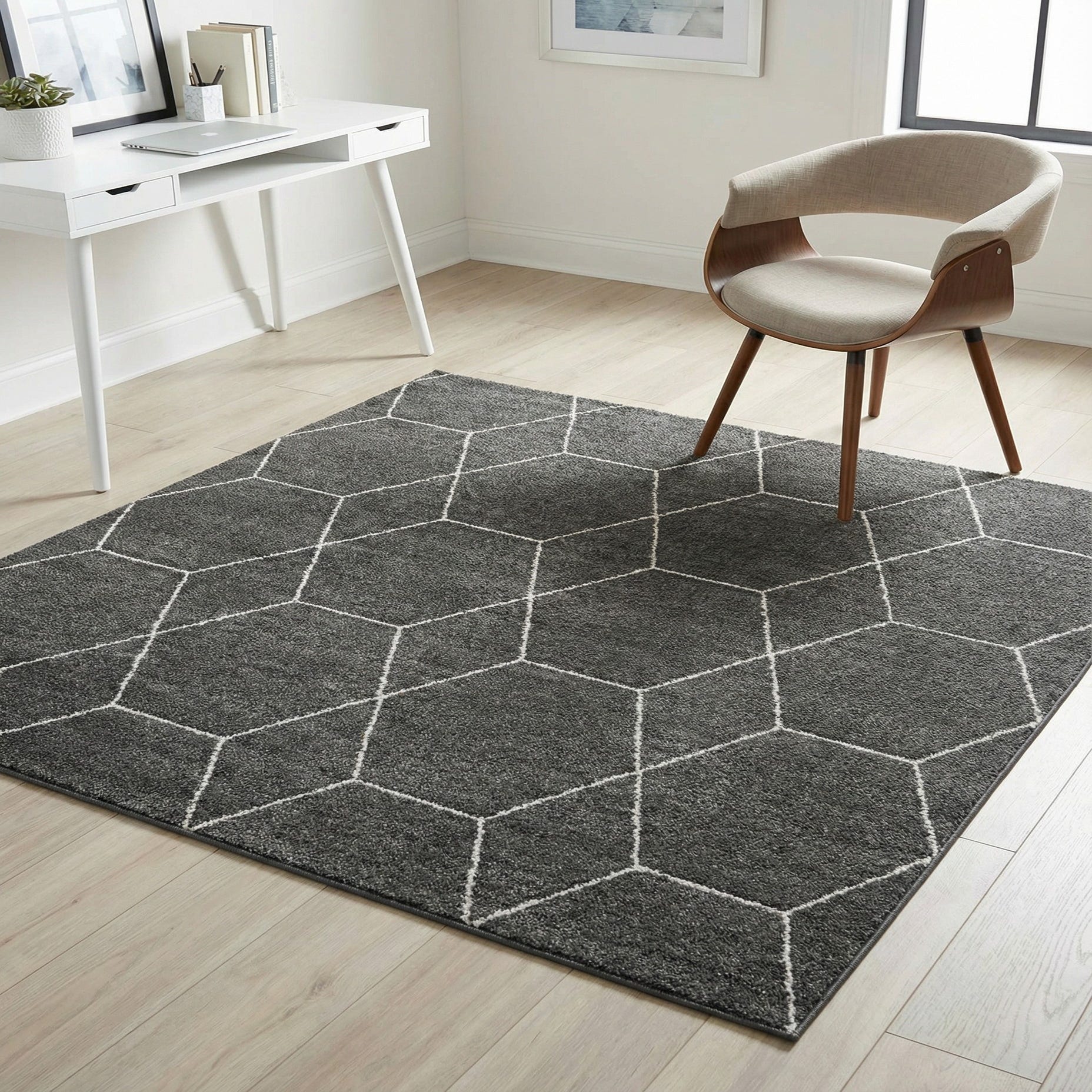 A clean hexagonal lattice in ivory threads traces a repeating honeycomb across a deep dark gray ground, creating a graphic yet restrained pattern that reads modern and organized. The geometric lines are slightly raised against the pile, giving the surface a gentle dimensional feel when you run your hand across it. Machine-made of 100% polypropylene, the construction produces a dense, plush texture that provides a soft, cushioned underfoot sensation without appearing overly lofty.