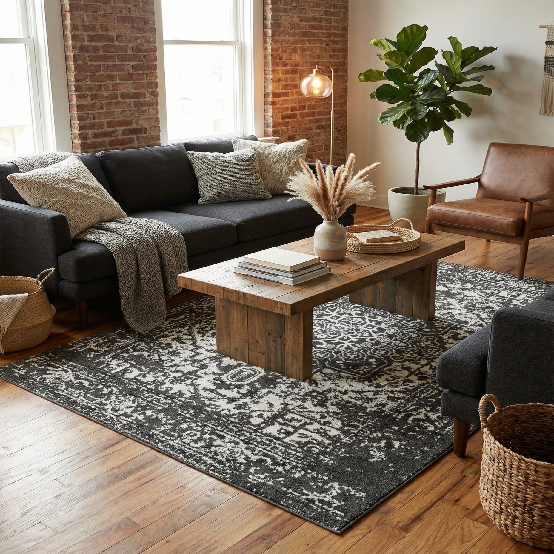 This piece works well as an anchor under a sofa and coffee table in a living room, layered beneath a bed to add pattern without competing with bedding, or placed in an entry or home office to introduce graphic interest. It pairs nicely with warm wood tones and leather seating for an inviting, grounded palette, or with cool metal accents and light upholstery for a more contemporary contrast.