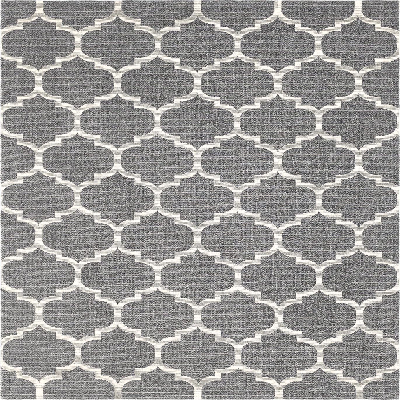 A 6x9 rectangular gray area rug with a repeating white trellis pattern, suitable for a modern living room.