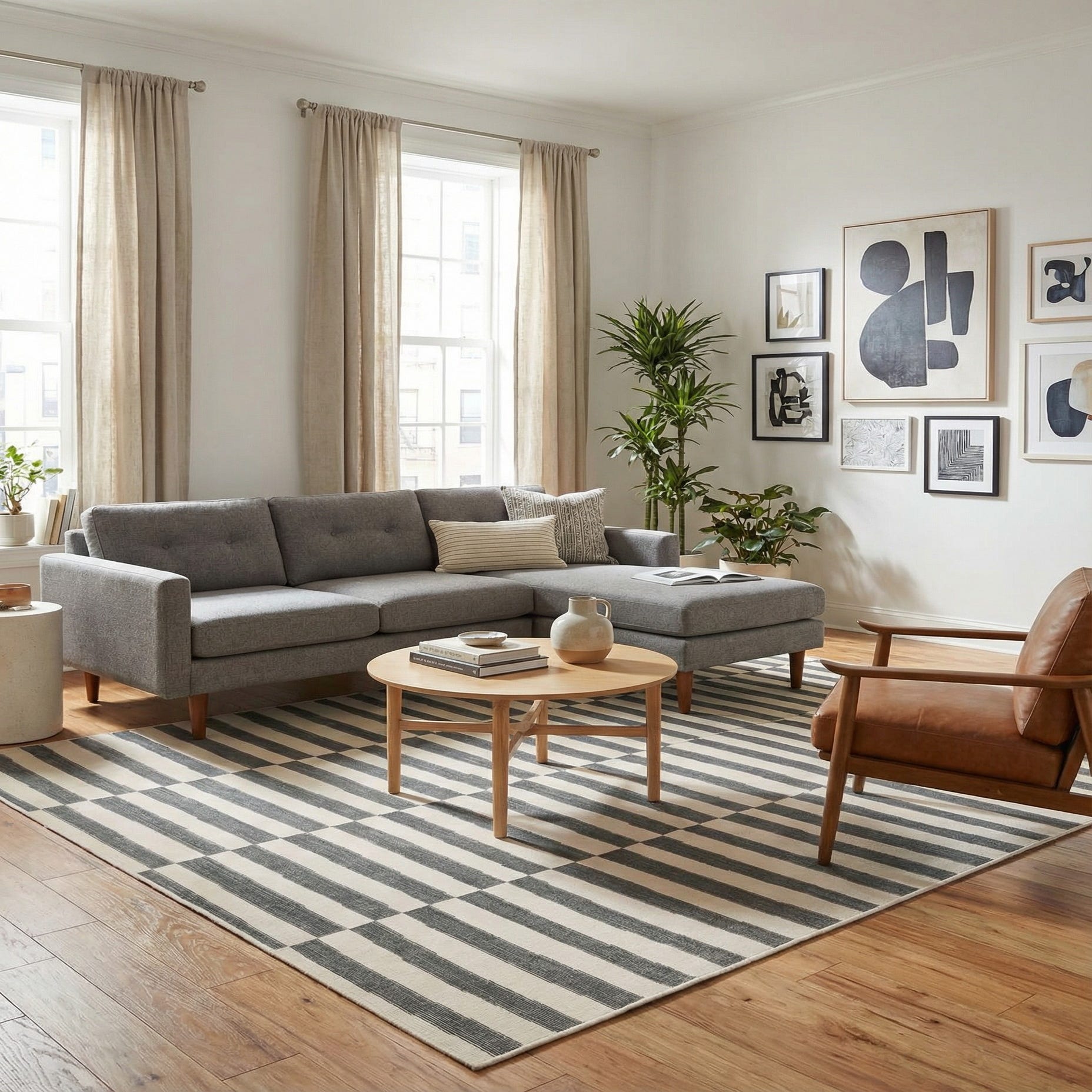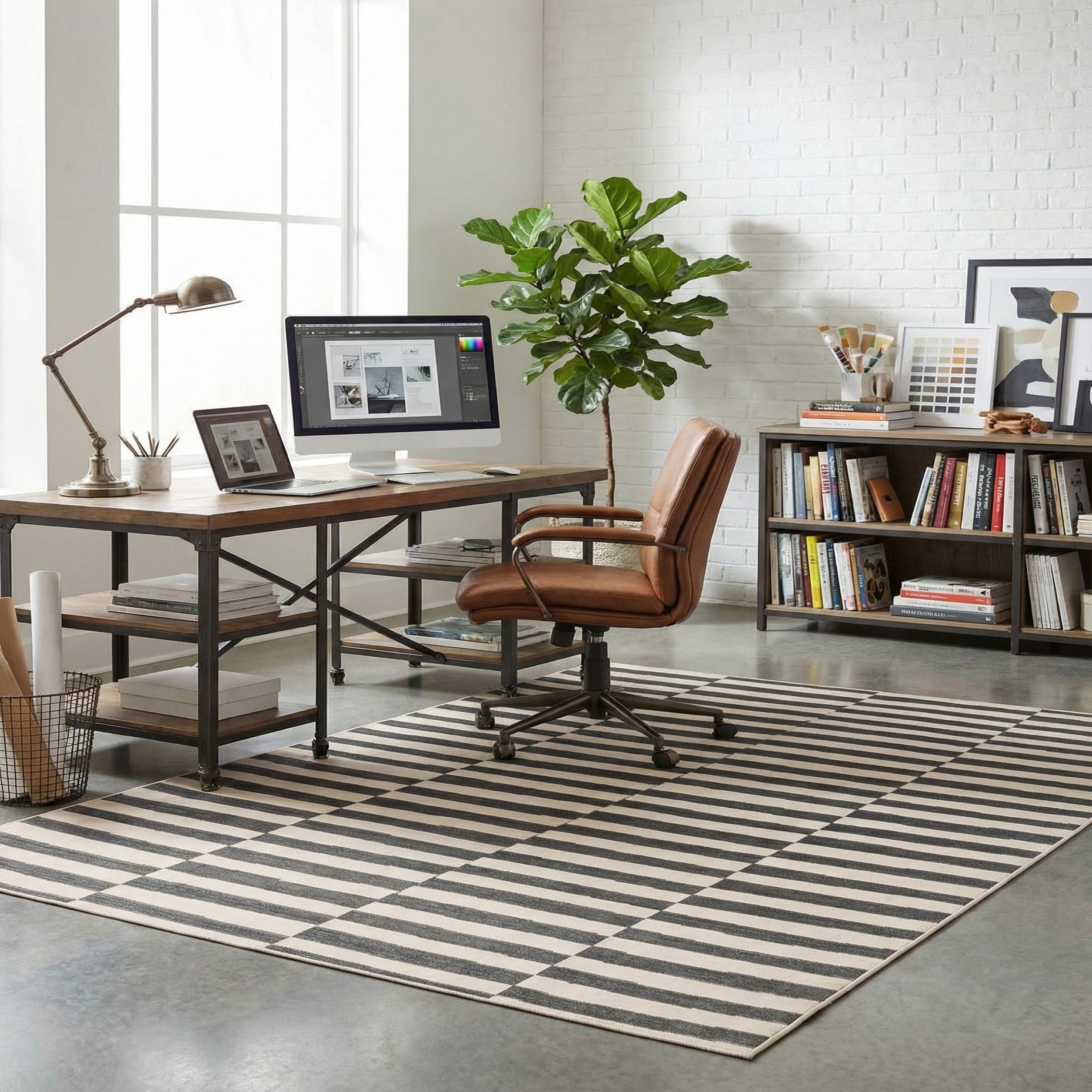 This rug works well in contemporary and minimalist interiors where clean lines and contrast are key — pair it with warm wood furnishings to soften the palette or with metal and glass pieces for an industrial edge. It can anchor a living room seating group, sit beneath a dining table to add graphic interest, or define a home office or entryway with a crisp, modern statement.