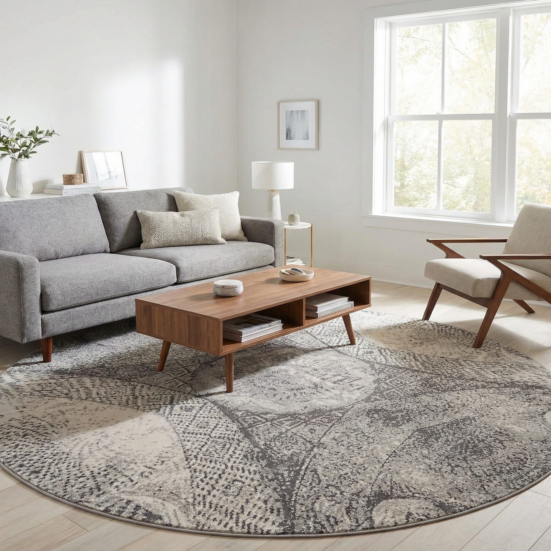 This piece is well-suited beneath a round dining table, as a focal point in a cozy seating nook, or in an entry where a defined shape helps organize the space. It pairs naturally with warm wood furniture, matte metal accents, and neutral upholstery, and complements styles from transitional and modern farmhouse to industrial and contemporary interiors. The neutral palette provides enough depth to anchor a room while remaining versatile with layered textiles and varied finishes.