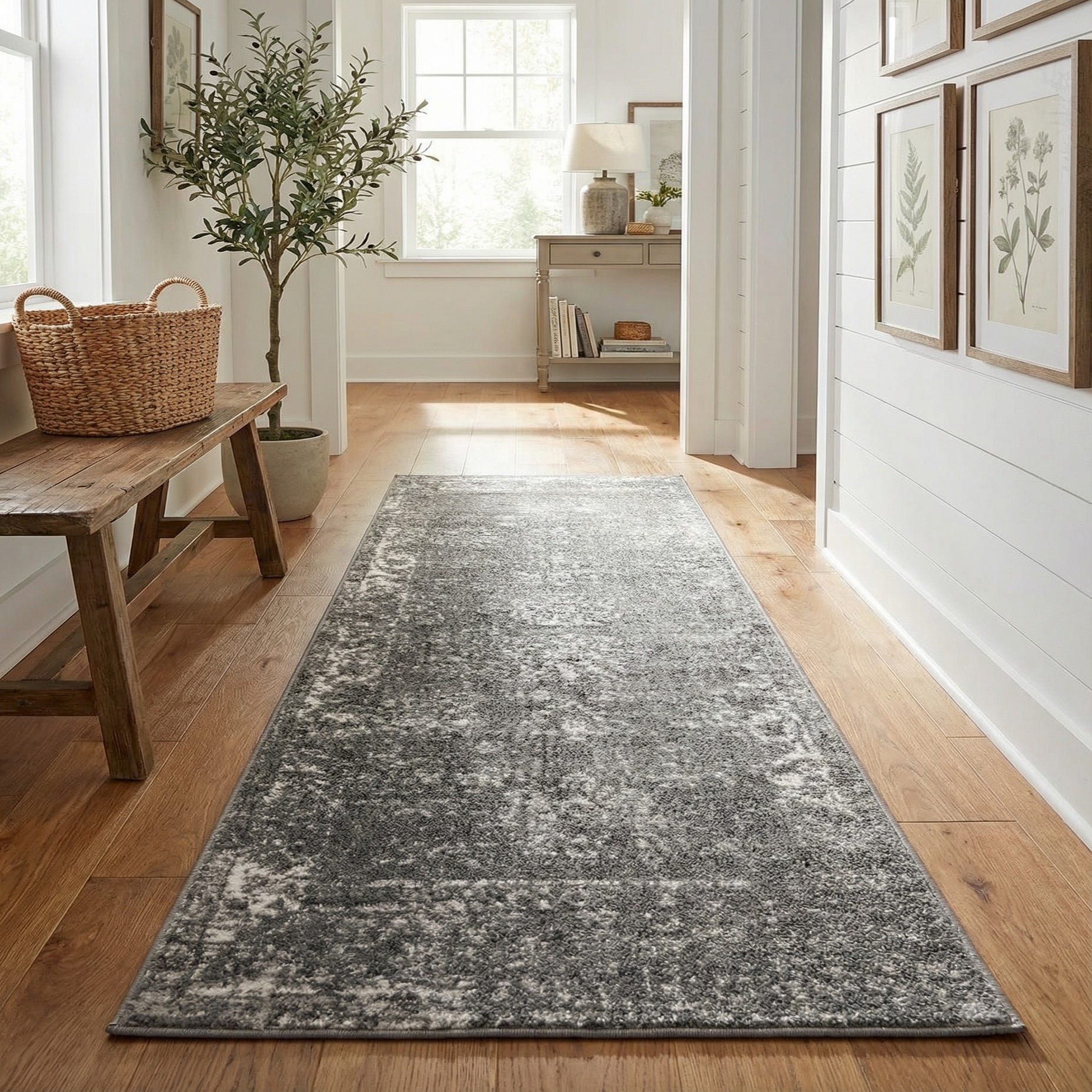 This runner works well in narrow or transitional spaces—place it in a hallway, alongside a bed, or down a kitchen gallery to add muted texture and visual continuity. It pairs naturally with cool-toned furnishings, metal or black iron accents, and warm wood finishes; in modern, transitional, or industrial interiors the neutral palette brings balance, while in minimalist or Scandinavian schemes it adds a layer of quiet pattern and softness underfoot.