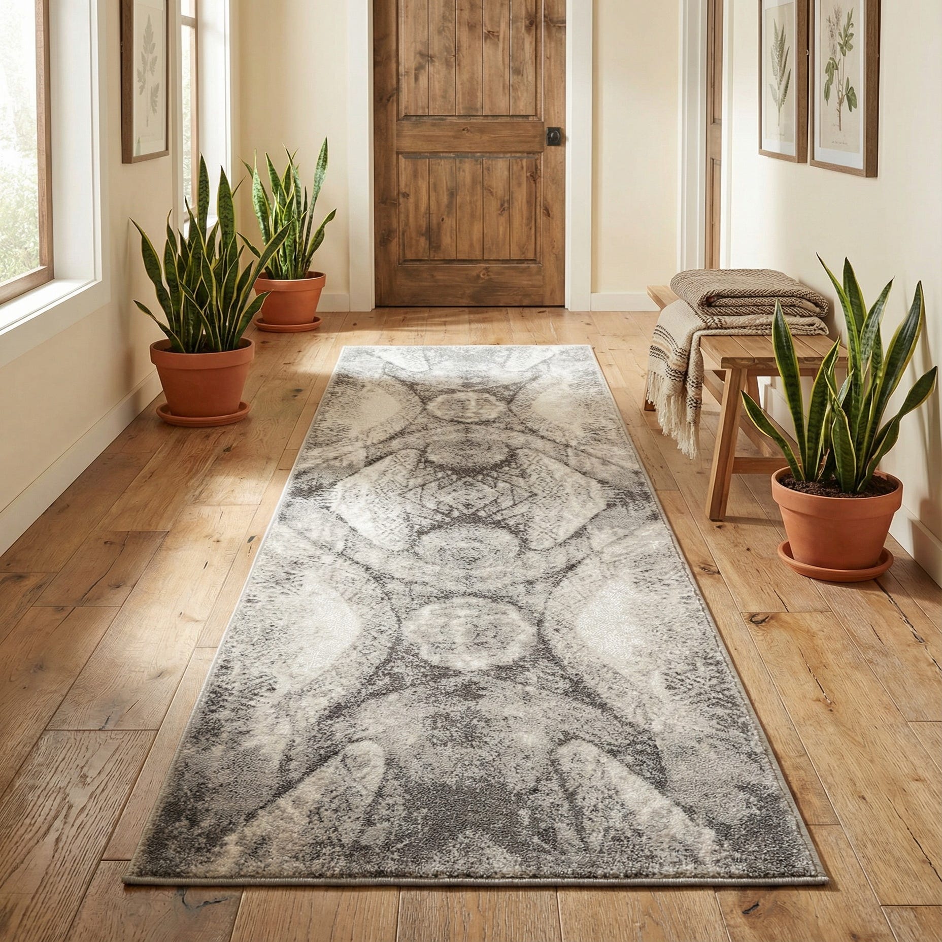 This runner fits naturally in narrow circulation spaces — hallway, entryway, or kitchen — and pairs well with cool, neutral palettes. It complements contemporary and transitional interiors, adding texture to minimalist rooms or softening industrial finishes like metal and concrete. Use it to anchor a console table, define a corridor, or layer at the foot of a bed to introduce pattern and muted contrast without overwhelming the room.