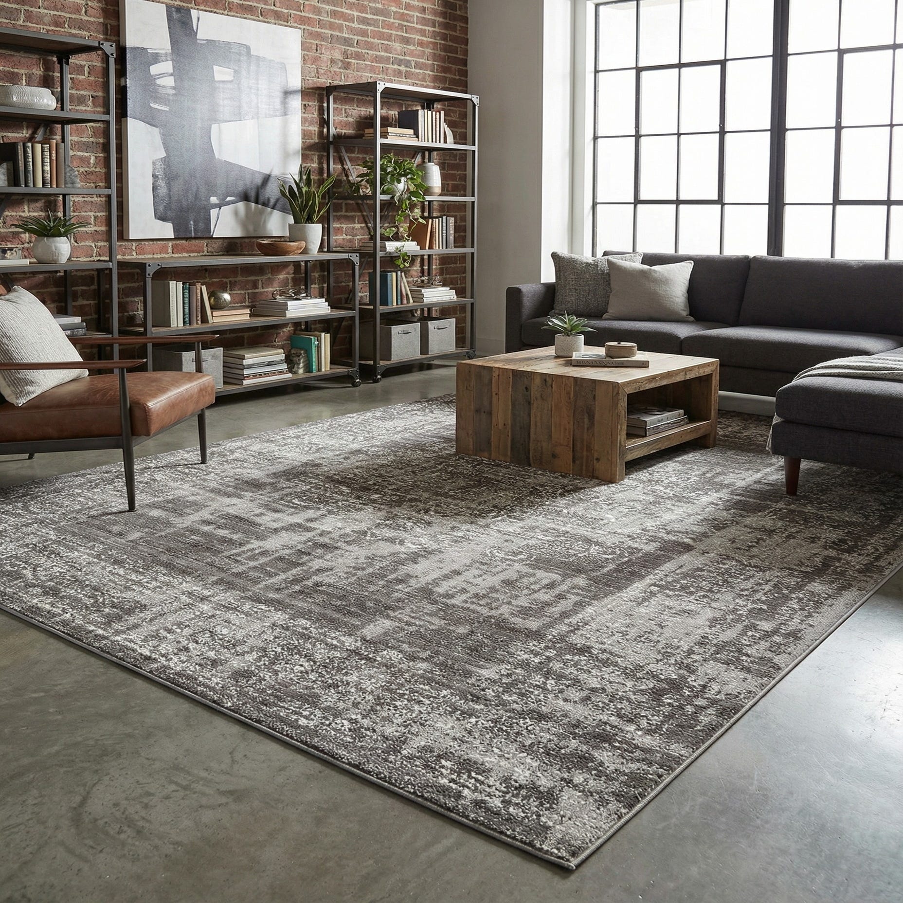 Machine-made from 100% polypropylene, the rug has a low, soft pile with a slight, understated sheen and a tightly finished weave that feels smooth underfoot. It works well beneath a sofa and coffee table in a modern living room, layered in a neutral bedroom for added warmth, or paired with metal and wood pieces in an industrial or transitional dining area. The color palette and texture make it an easy choice for spaces that benefit from a calm, collected foundation.