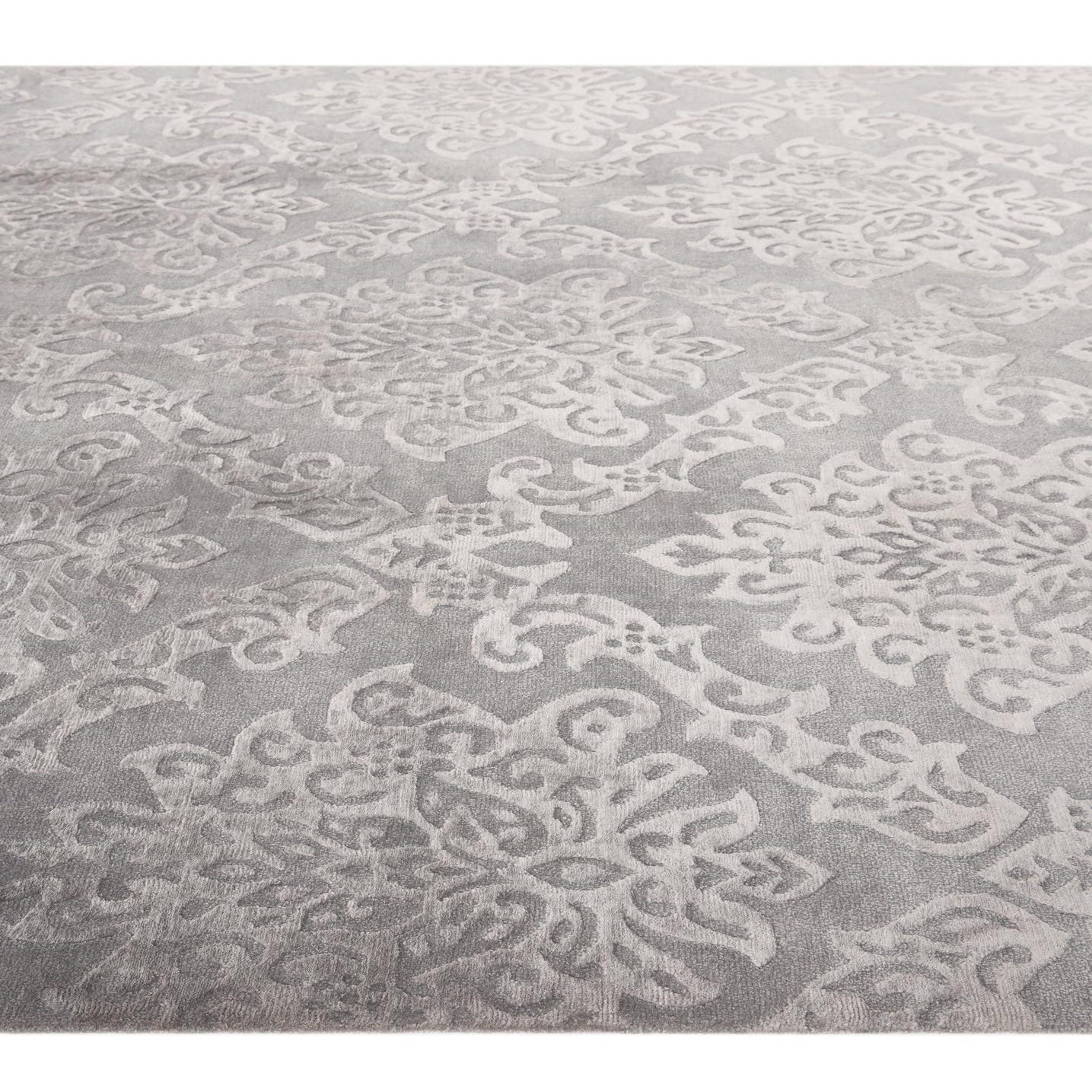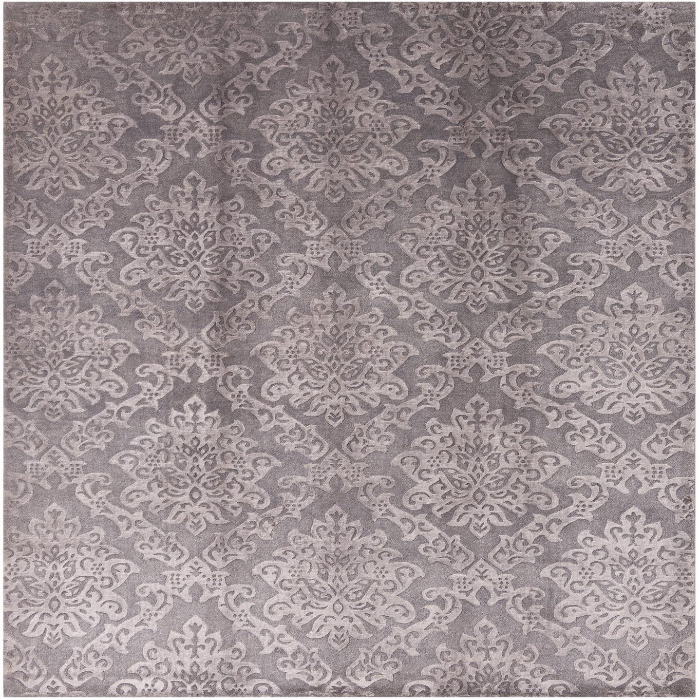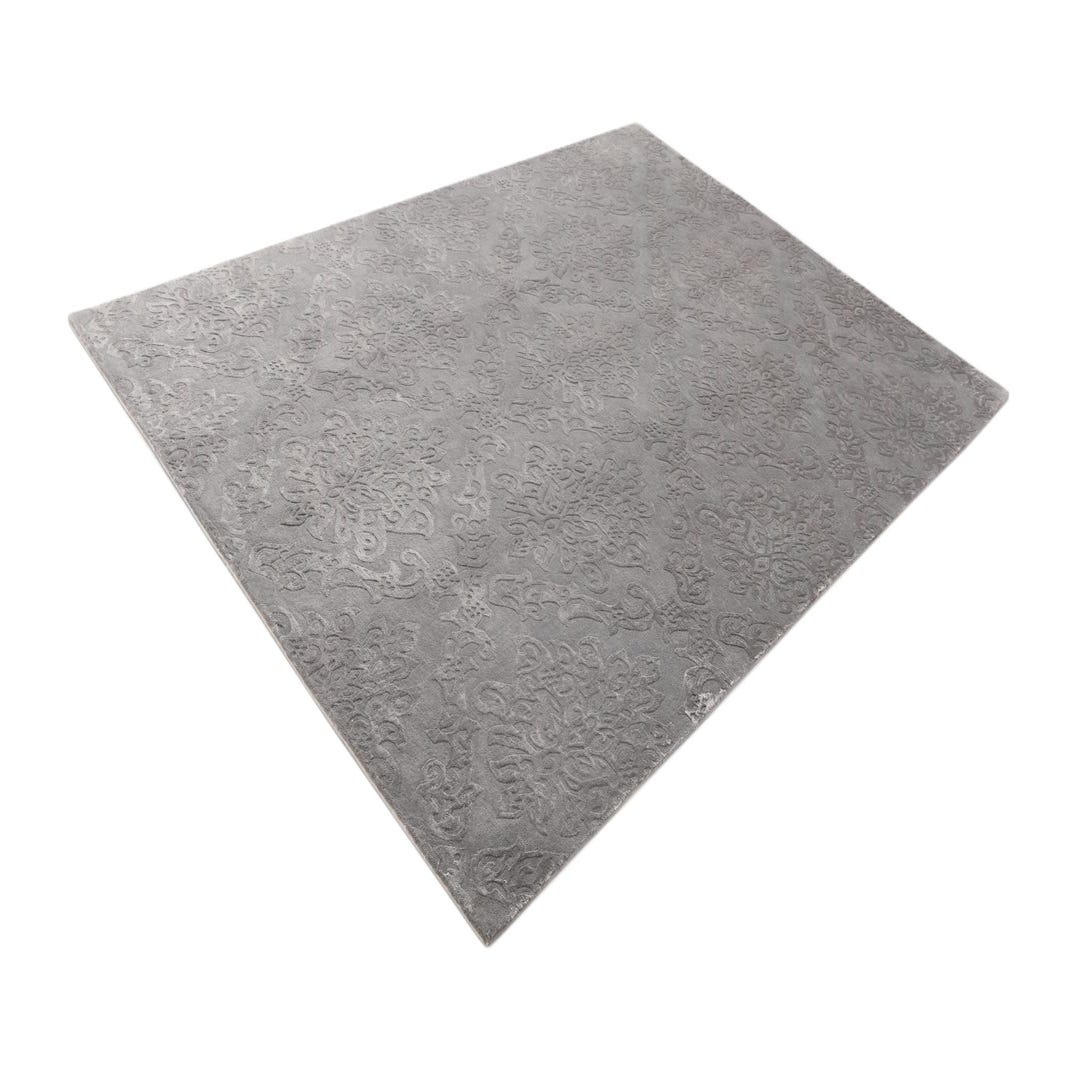 A 7x10 rectangular gray wool rug with an elegant, subtle modern oriental damask pattern, suitable for a living room.