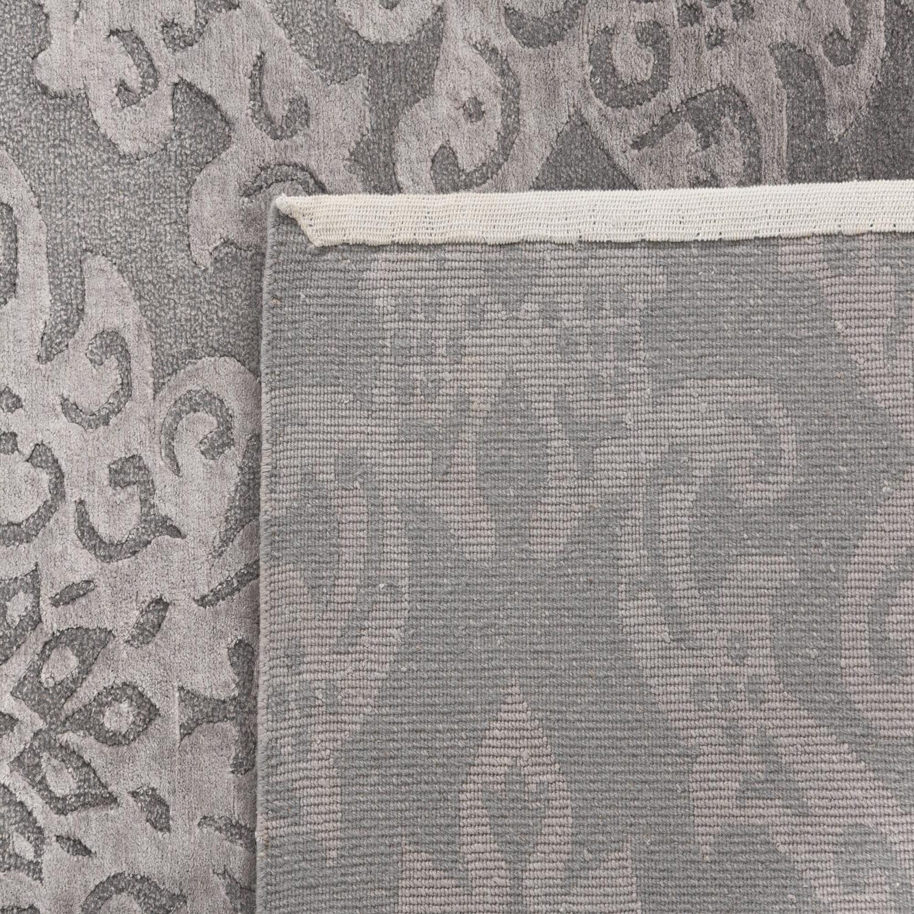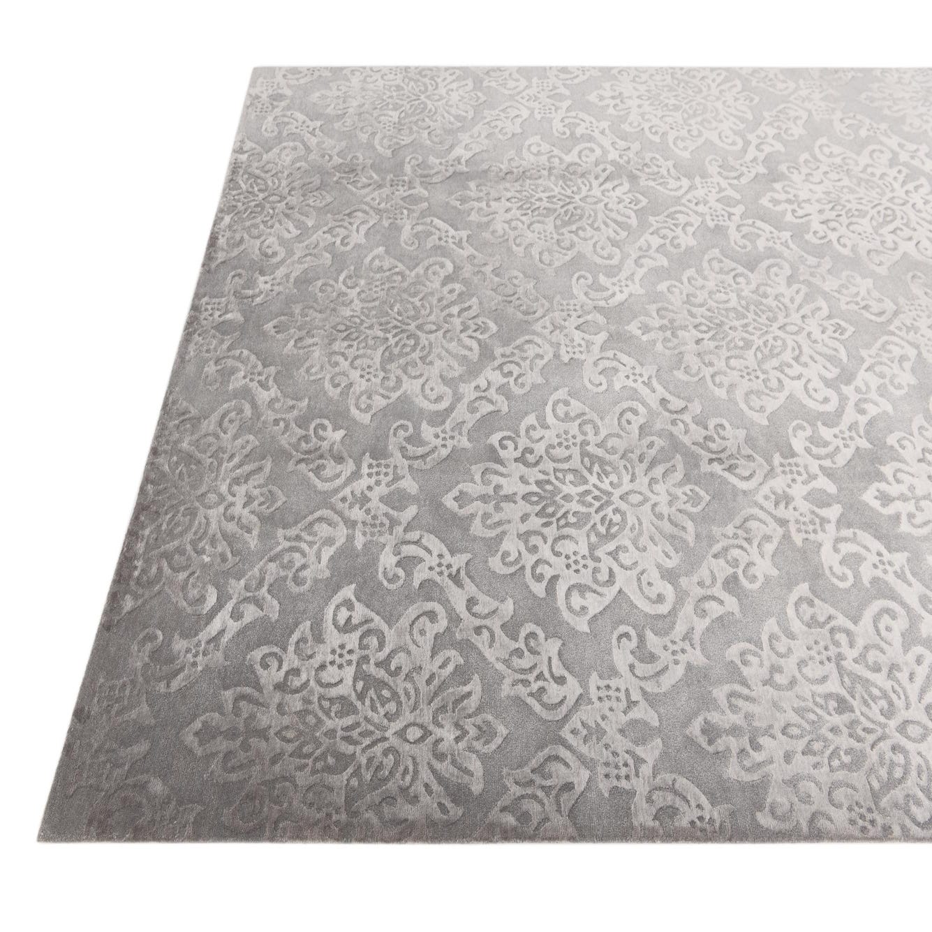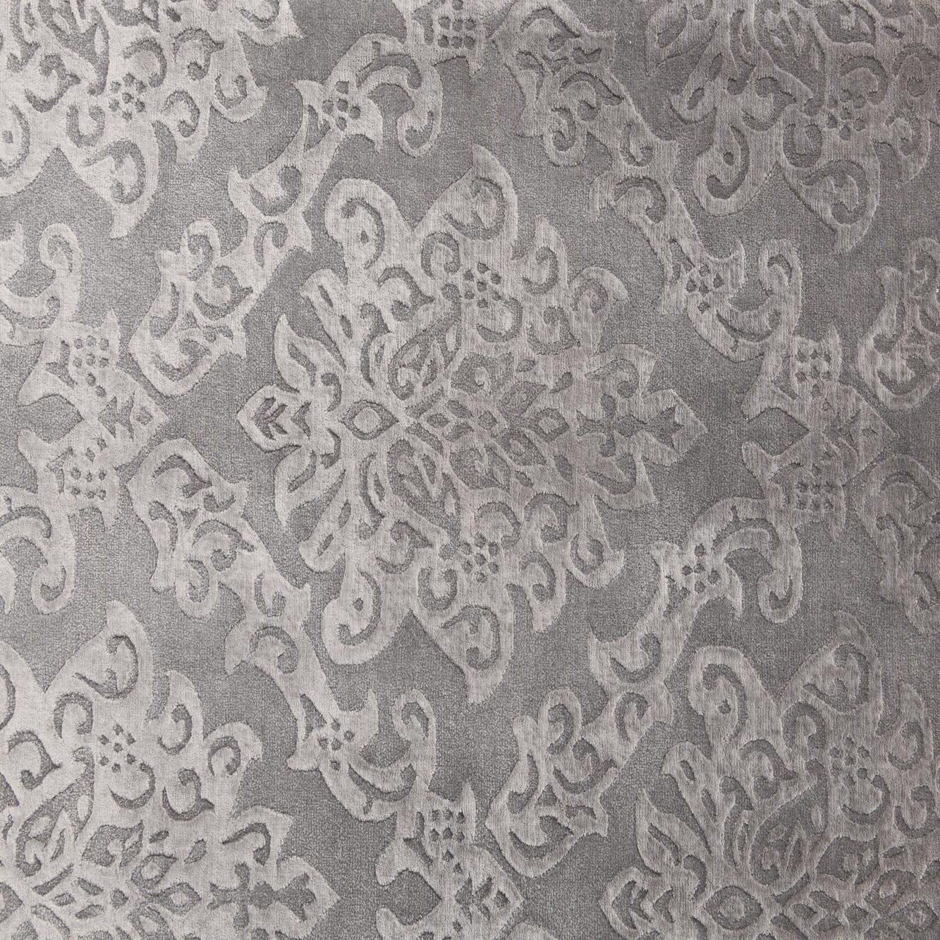 A 7x10 rectangular gray wool rug with an elegant, subtle modern oriental damask pattern, suitable for a living room.