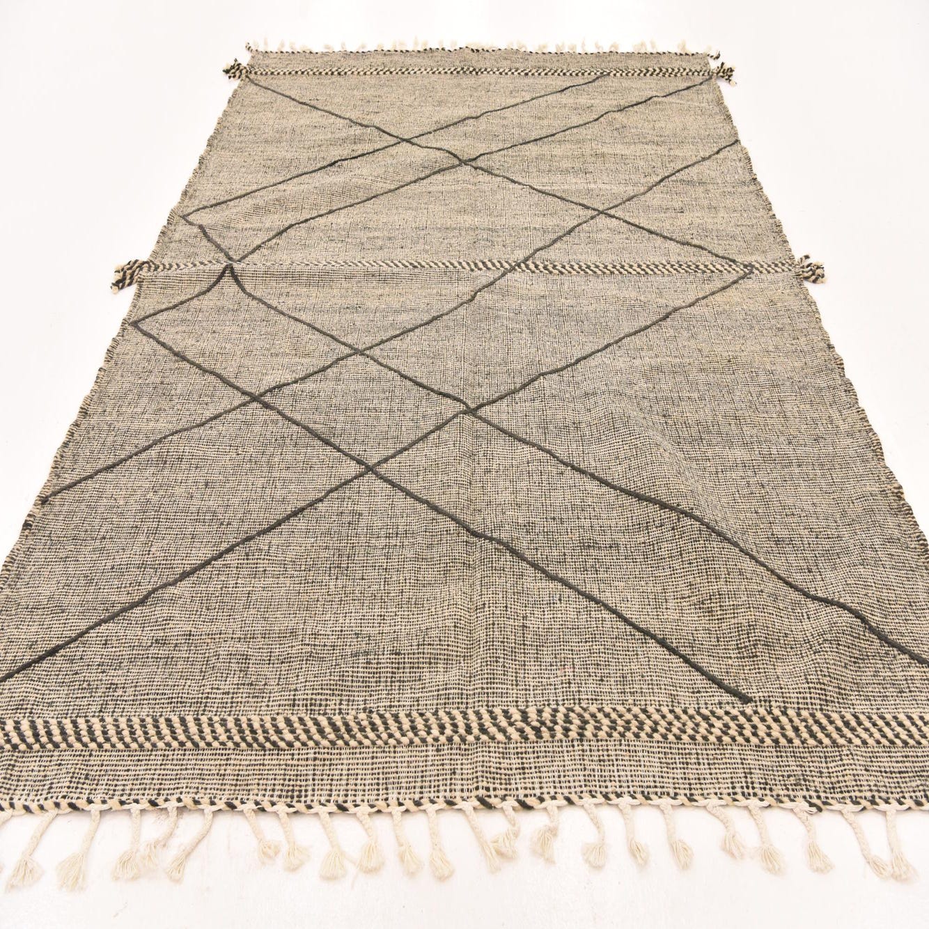 Part of our Moroccan collection, this hand-knotted rug measures 7x10 and is crafted from 100% wool, providing a natural, durable texture. The background is rendered in dark gray, while the pattern features contrasting ivory lines creating an engaging geometric design. With a semi-antique age of 40-60 years, this piece carries a sense of history and tradition. The distinct fringe adds to its authentic charm.