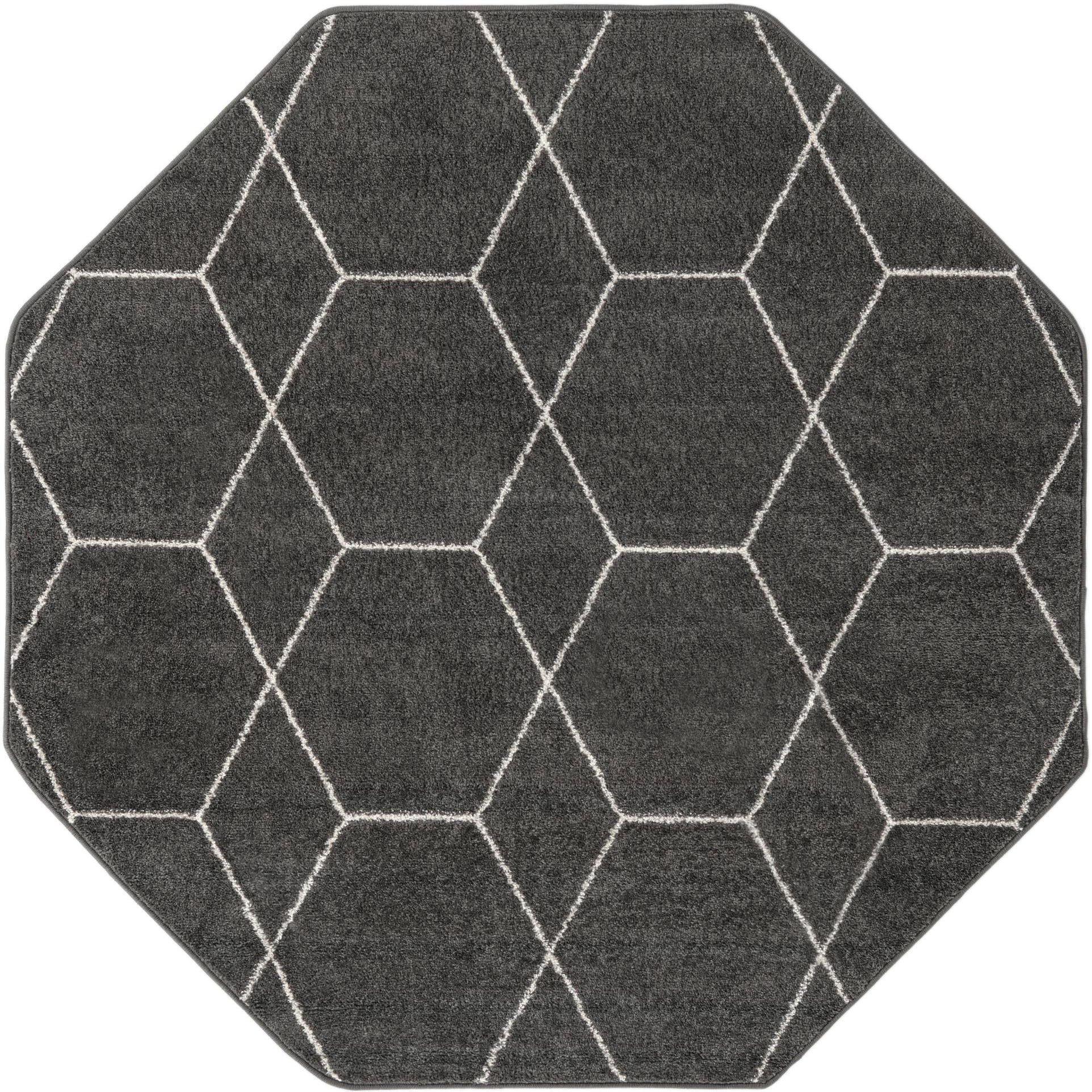 A crisp geometric lattice of interlocking hexagons is rendered in ivory against a dark gray ground, creating a clean, modern pattern that reads architectural and deliberate. The octagonal shape reinforces the geometry and gives the piece a sculptural presence. Machine-made in 100% polypropylene, the pile has a low-to-medium height with a soft hand underfoot and a subtly even surface that keeps the pattern clear and defined.