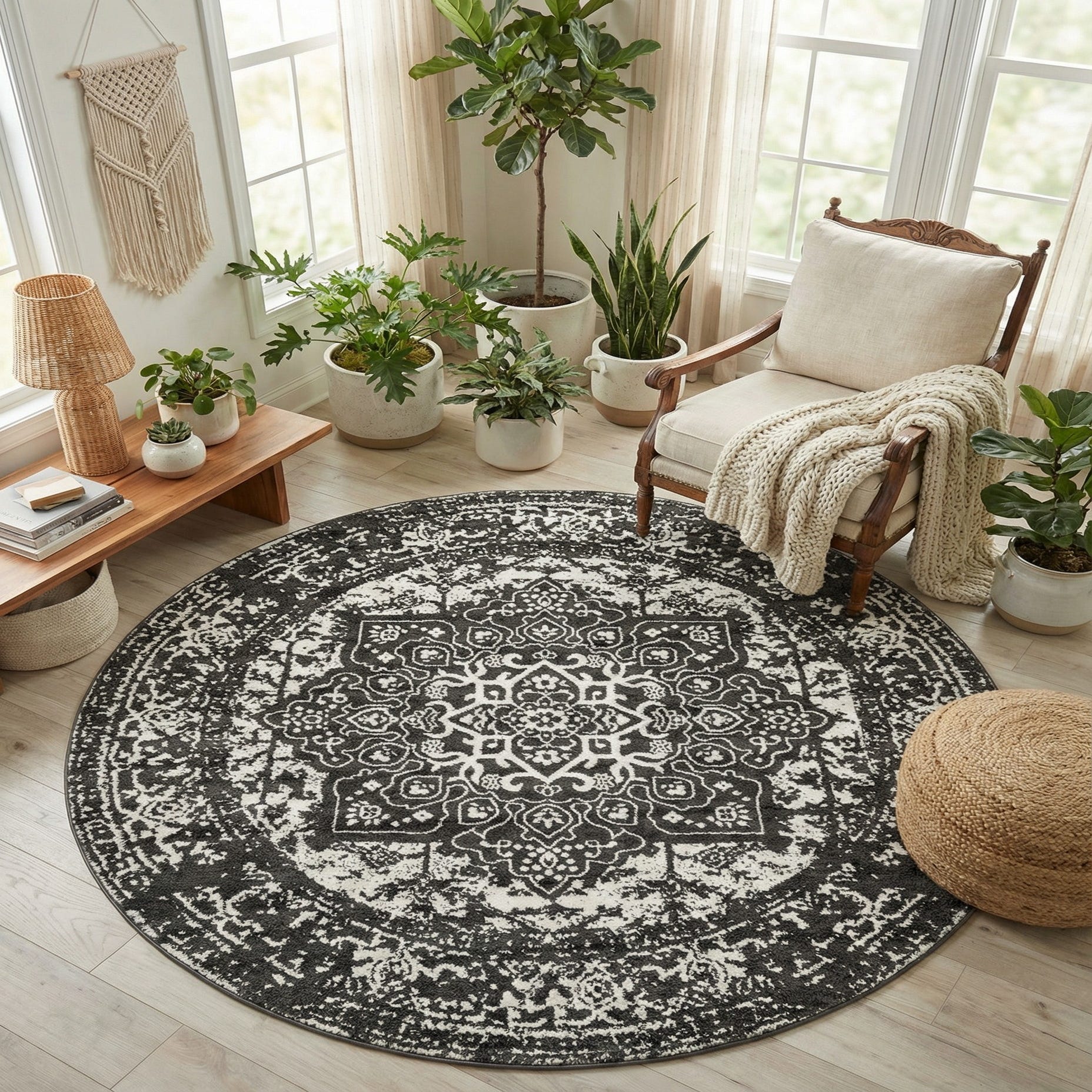 A classic medallion pattern grounds this round rug, with an ornate central motif and layered border motifs worked in ivory against a dark gray background. The design carries a gently distressed finish that gives the pattern a lived-in, vintage-inspired character without feeling fussy. Machine-made from 100% polypropylene, the pile is low-profile and tightly constructed, offering a smooth, slightly springy hand underfoot that holds the pattern definition clearly.