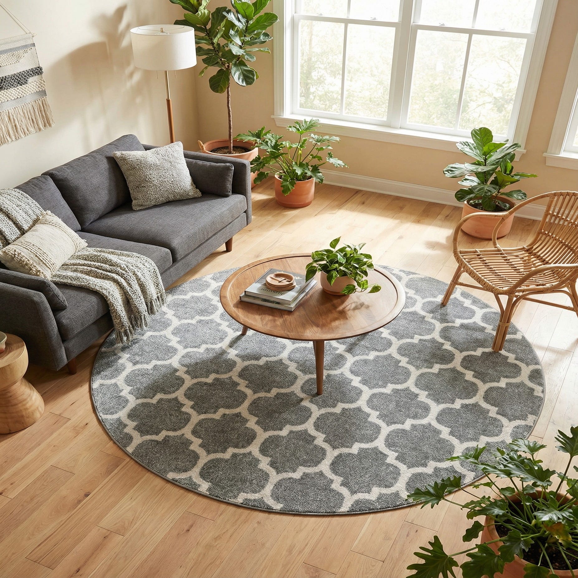 Thanks to its stain-resistant and shed-free properties, this rug is practical for high-traffic areas and households with pets or children. Its rounded shape and classic two-tone color scheme make it an ideal choice for a variety of interior designs, from modern minimalist settings to more traditional spaces. This rug could complement a warmly lit reading nook, serve as a grounding element in a contemporary studio, or add dimension to an office or bedroom with sleek furniture. The Lattice collection rug's sophisticated pattern and neutral palette ensure it will integrate smoothly into any decor seeking a touch of elegance and refinement.