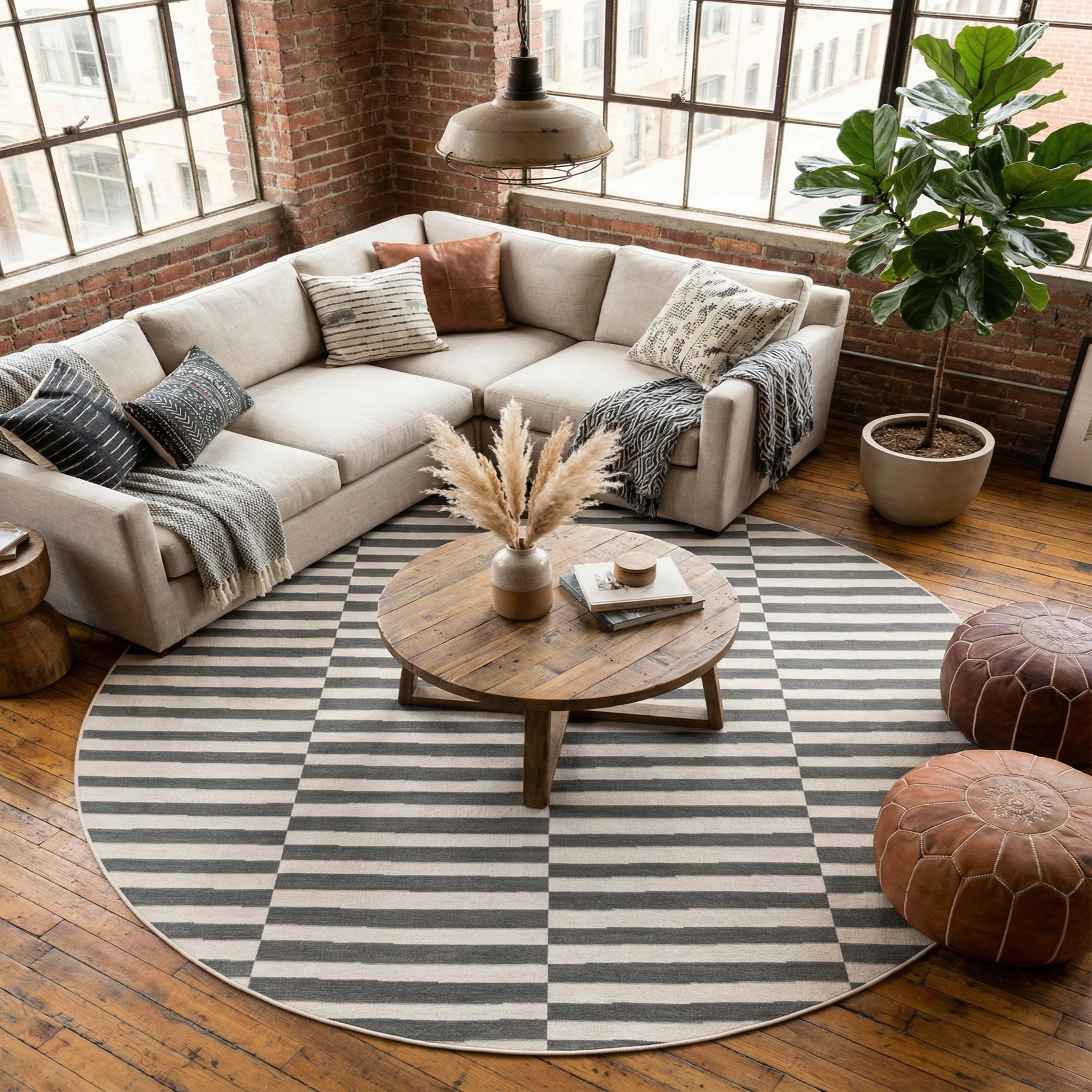This piece pairs easily with clean-lined furniture and neutral textiles—place it beneath a circular dining table to anchor seating, set it under a living room conversation group to define the area, or use it in an entry or home office for a graphic, modern touch. It complements light wood and black metal finishes, linen upholstery, and layered textures, and fits well with mid-century modern, Scandinavian, or industrial-inspired interiors.