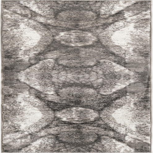 A gray and silver 8 ft runner rug with a distressed traditional pattern, perfect for a hallway or kitchen.