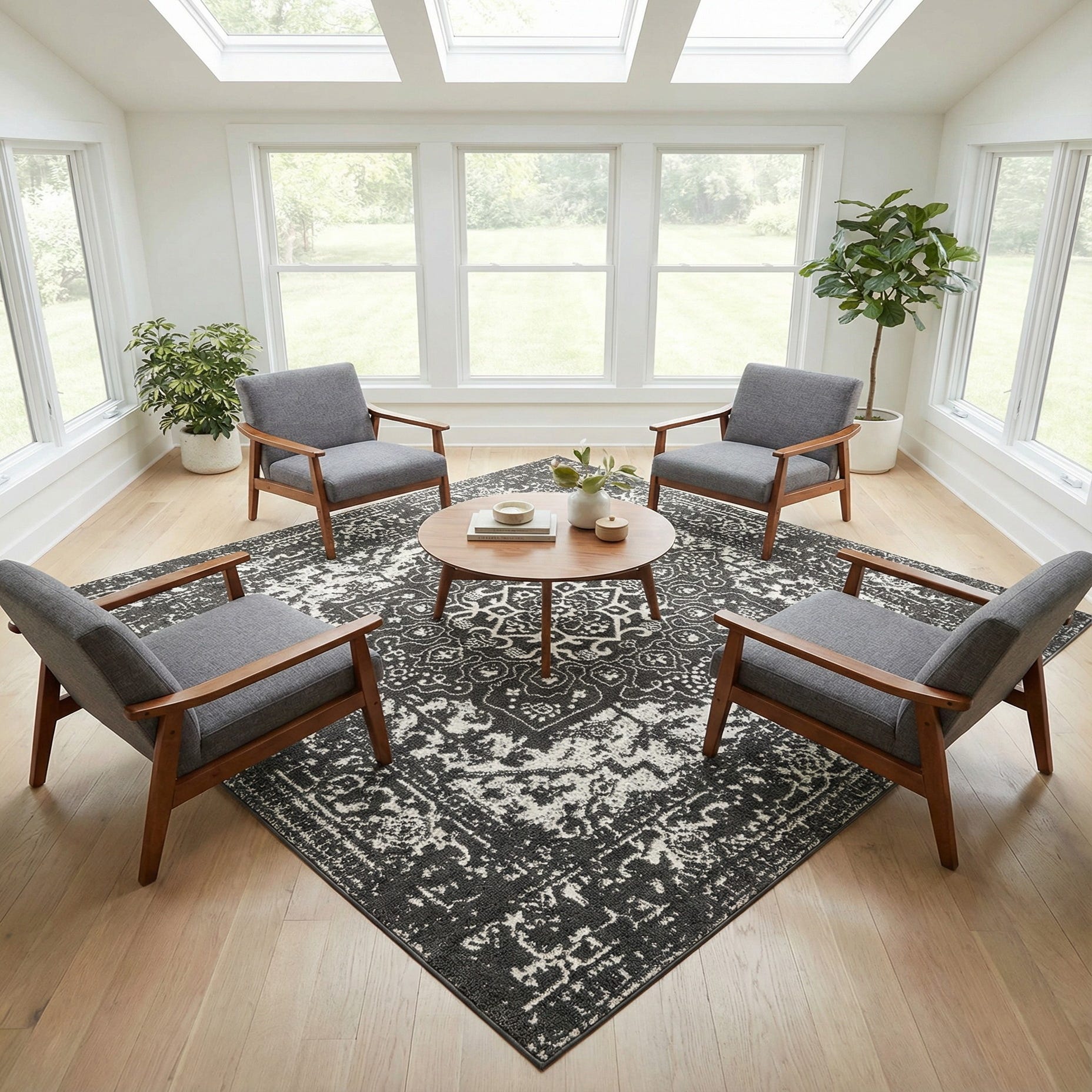 Place this rug under a seating group to ground a living room, center it beneath a dining table for a balanced, formal feel, or layer it in a bedroom to add contrast against light wood floors. Its neutral dark gray and ivory palette works well with modern minimalism, transitional interiors, and industrial lofts, and it pairs cleanly with metal or wood furnishings and muted accent textiles.