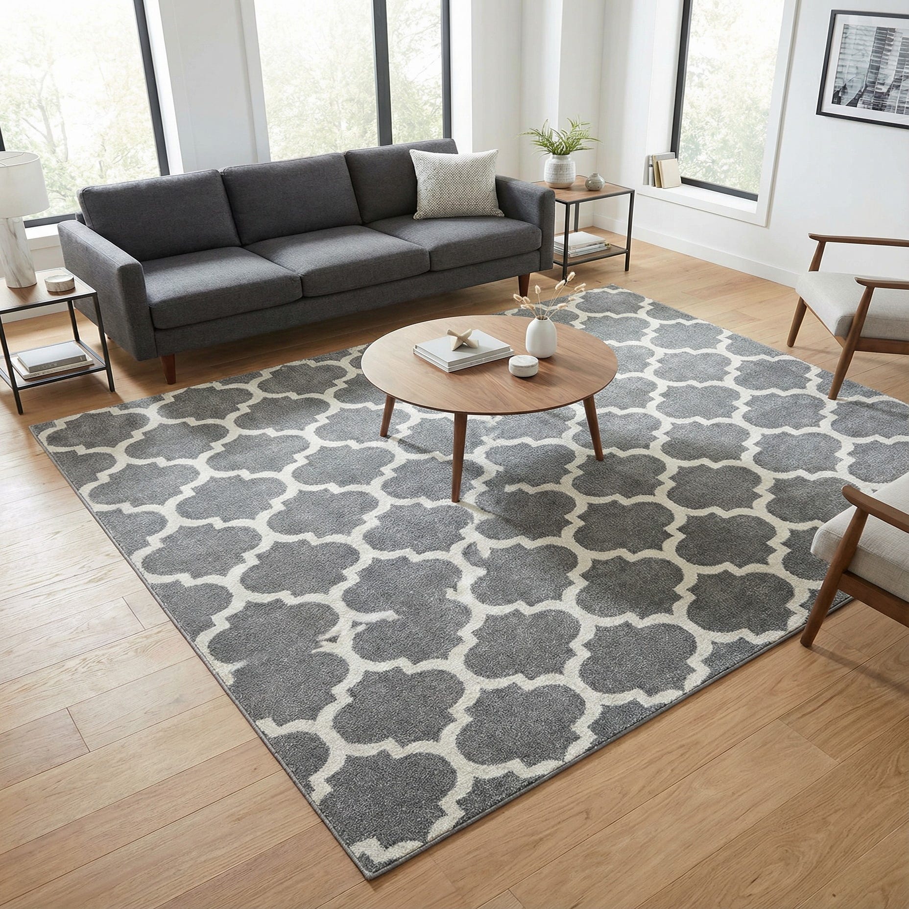 The Lattice collection offers a timeless design with a modern twist. This 8 Ft Square rug features a classic lattice pattern that brings a sense of structure and symmetry to any space. The pattern is articulated in a contrasting beige that stands out against the dark gray background, offering a sophisticated palette that can anchor a room with ease.