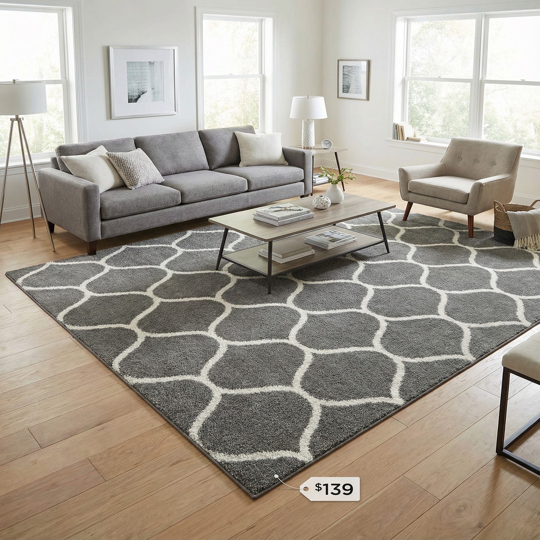 This rug works well as an anchor in contemporary or transitional interiors — place it beneath a coffee table to define a living area, layer it under a bed to add contrast to neutral bedding, or set it beneath a desk in a home office for a polished, grounded look. The dark gray and ivory palette pairs easily with light woods, matte metals, and monochrome accents, and it complements both minimalist and more layered décor schemes.
