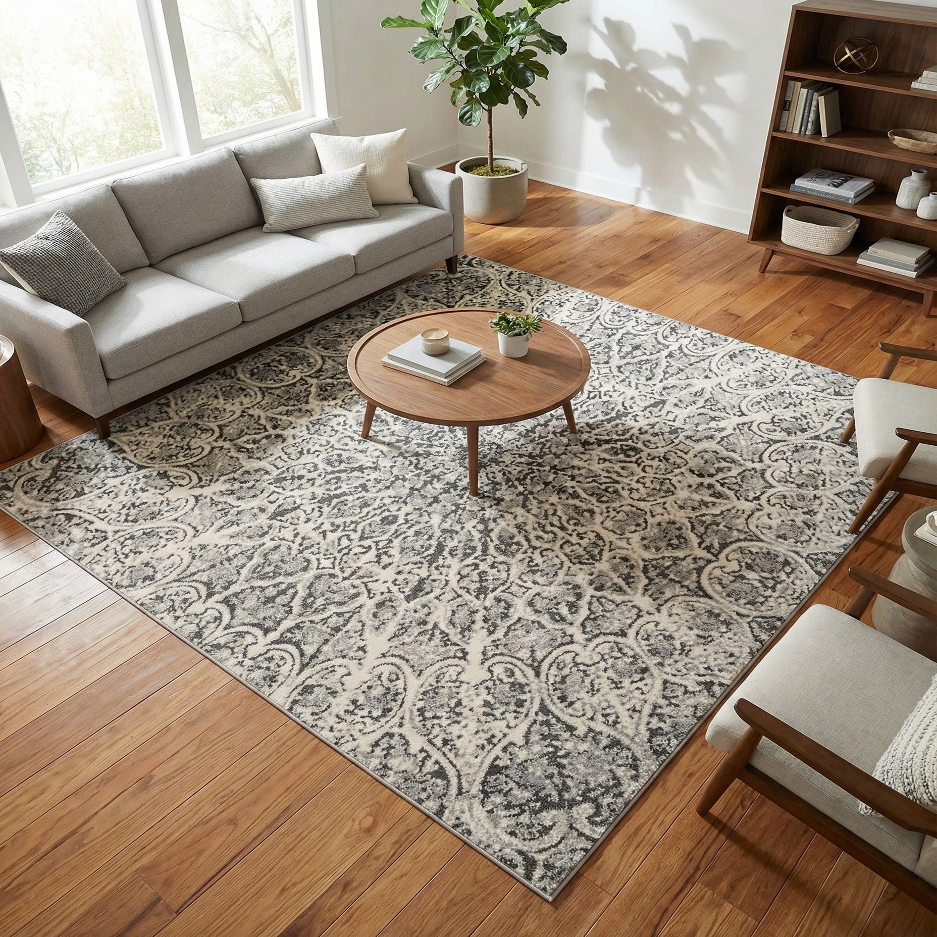 Primary color is Dark Gray. Colors in this rug include: Dark Gray, Gray, Ivory.