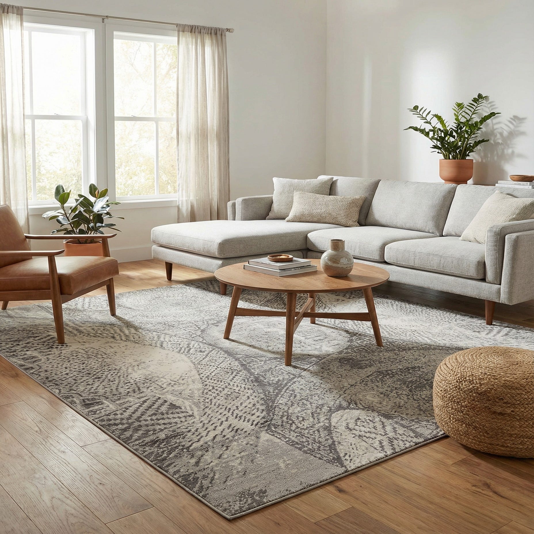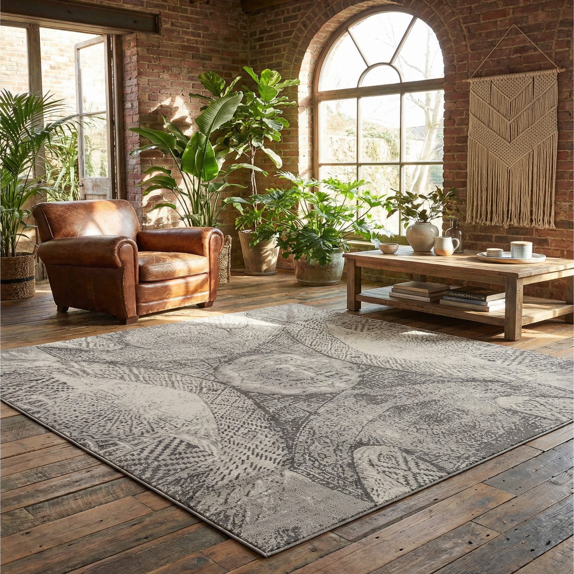 Machine-made from 100% polypropylene, the rug has a low-profile pile with a soft hand and a subtle sheen that catches light on the raised pattern areas. Its neutral palette and worn-in character make it suitable for a variety of interiors: anchor a modern living room beneath a sofa and coffee table, place it under a dining set to ground mixed materials like wood and metal, or layer it in a bedroom to add pattern without heavy color. Pair it with warm wood tones, leather seating, matte black accents, or pale linens for a balanced, contemporary look.