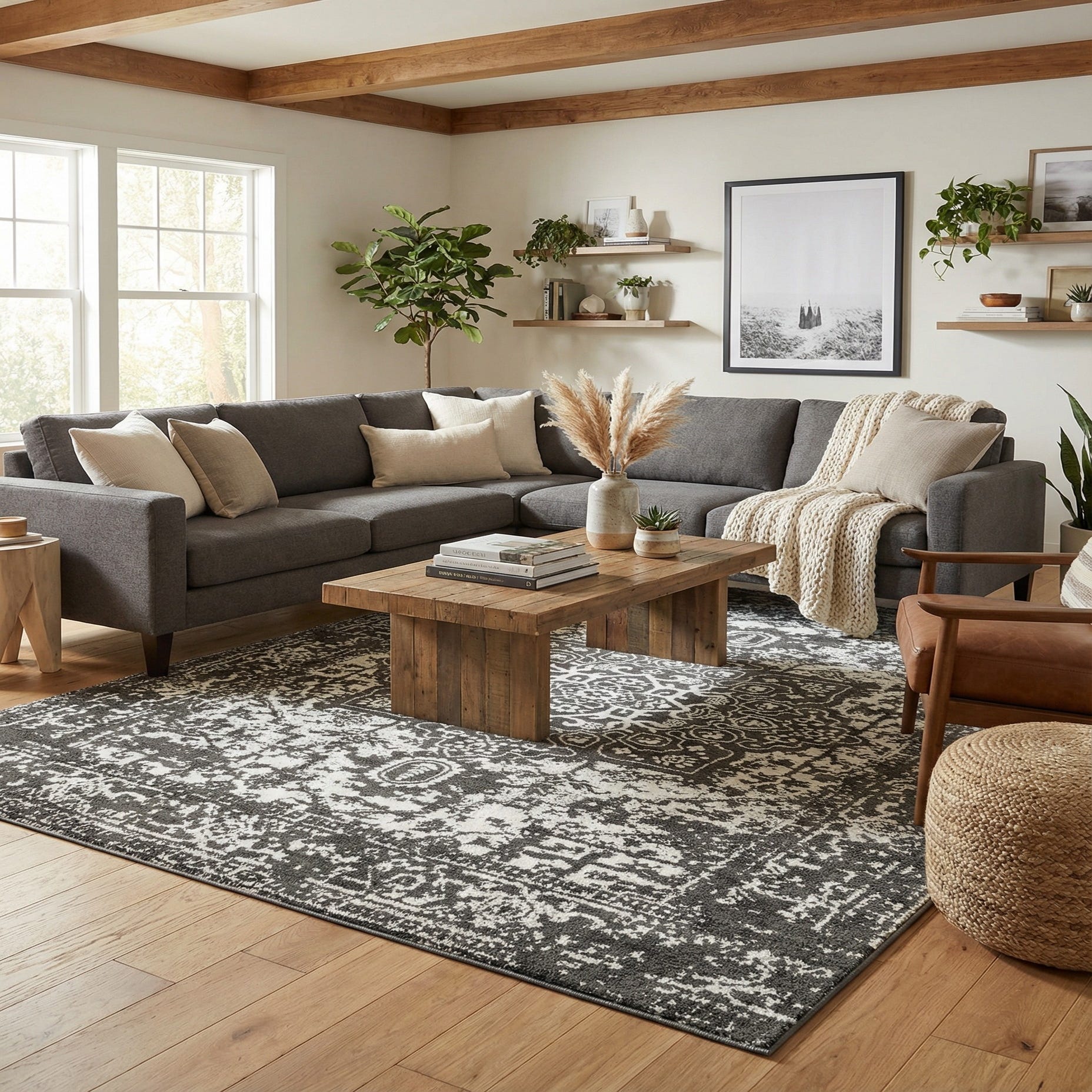 This piece fits a range of interiors — try it beneath a coffee table in a living room to anchor neutral seating, under a dining table to add pattern without heavy color, or layered at the foot of a bed to introduce texture. It pairs well with warm wood furniture, leather accents, linen upholstery, or black metal finishes for a balanced, contemporary-traditional mix.