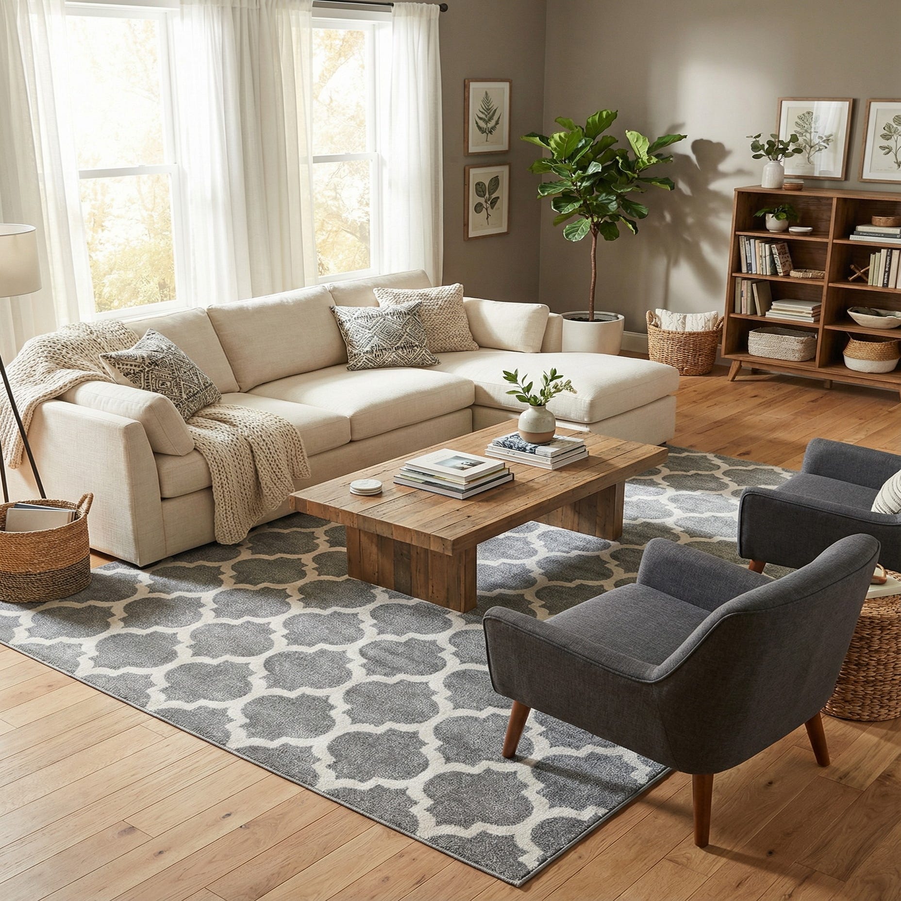This rug is suitable for a variety of interior design scenarios, including contemporary living rooms, minimalist bedrooms, or chic office spaces. Its neutral palette allows it to complement a wide range of color schemes, while the geometric pattern can serve as a subtle focal point without overwhelming the room's design elements. It pairs well with sleek furniture and can also help to ironically contrast more traditional decors.