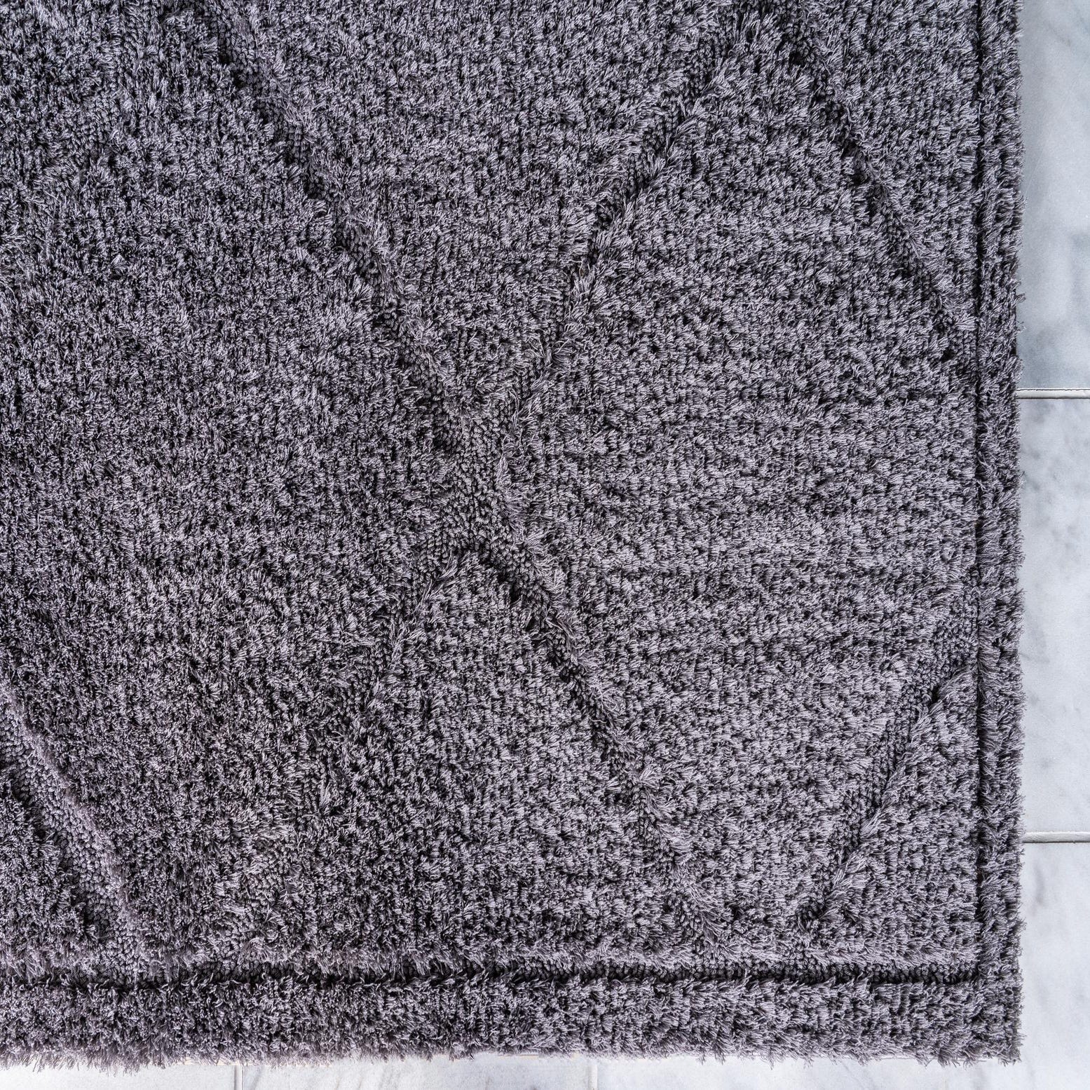A plush shag surface cut into a subtle geometric lattice gives this rug a calm, tactile presence. The dark gray background anchors the look while slightly lower-pile lines form a repeating diamond pattern, creating gentle depth and visual texture without contrasting colors. Machine-made from 100% polypropylene, the pile feels soft and cushioned underfoot while the patterned relief adds a low-profile sculptural detail.