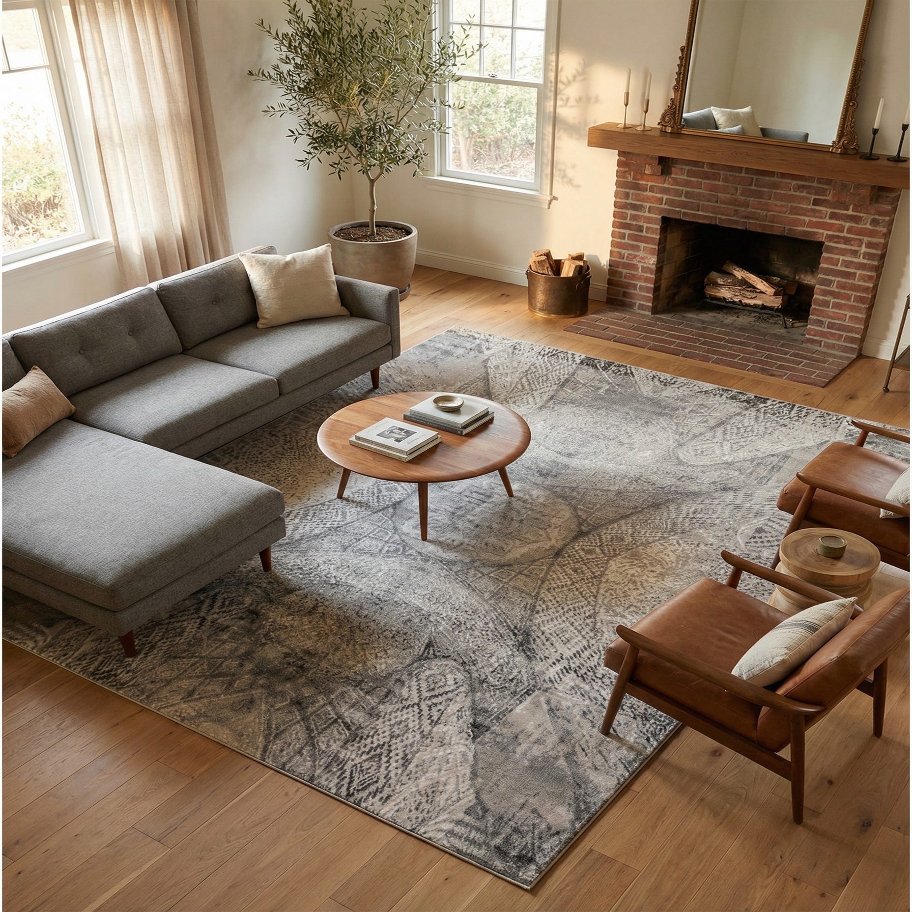 Machine made from 100% polypropylene, the rug has a low-pile, smooth texture that lies flat beneath furniture and feels soft underfoot. Its construction holds detailed patterning while remaining adaptable to everyday use. Place it under a sofa and coffee table to anchor a neutral living room, layer it in a bedroom to add quiet texture beneath a bed, or use it in a home office or dining area where a subtle, sophisticated foundation is desired. It pairs especially well with warm wood tones, cool metal accents, and a palette of soft neutrals for a calm, cohesive interior.