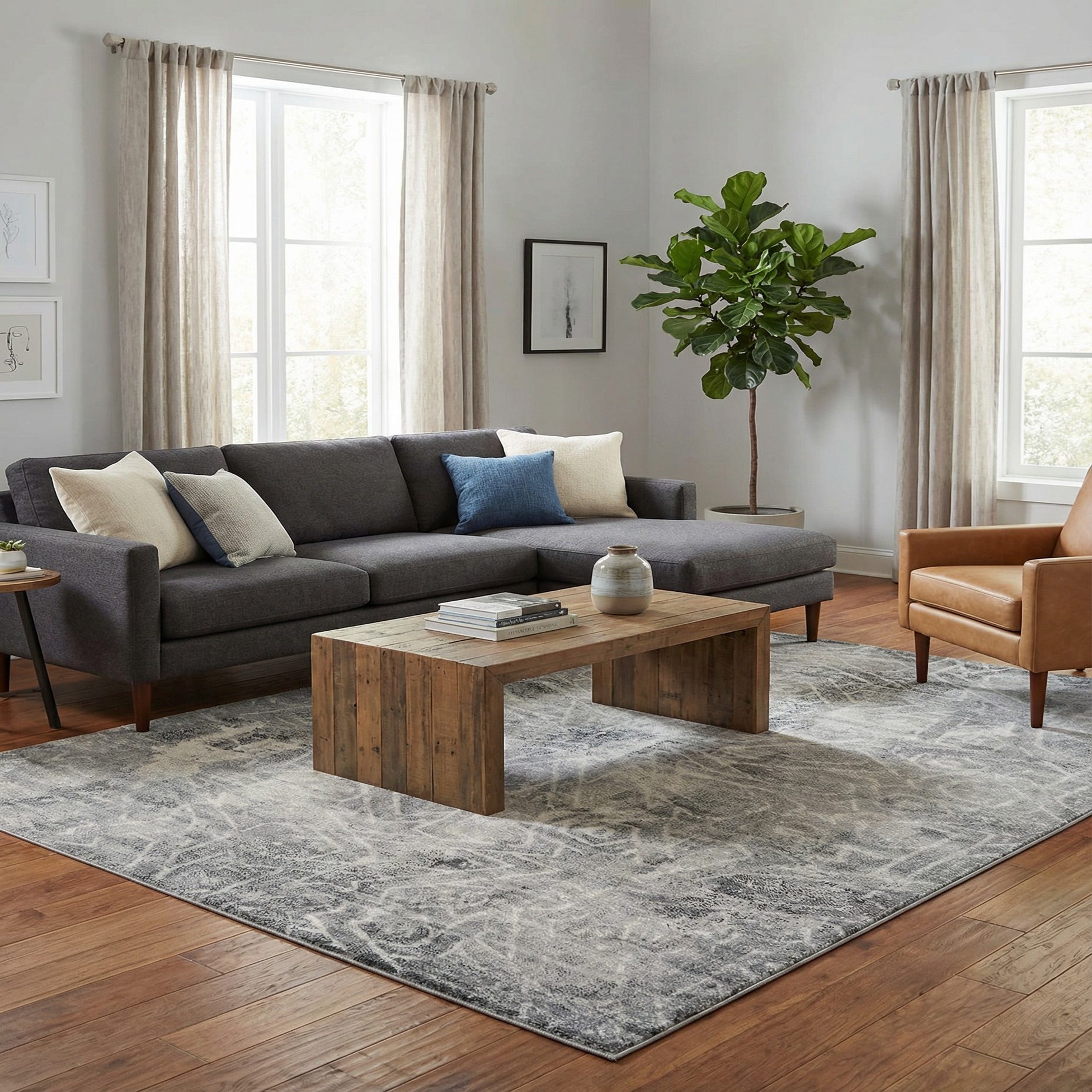 A softly distressed, vintage-inspired pattern unfolds across a dark gray background, where faded medallions and ornamental motifs in gray and ivory create a layered, tonal composition. The all-over design blends classic shapes with a washed, contemporary finish, giving the rug a relaxed, lived-in look that still reads as intentional and refined.