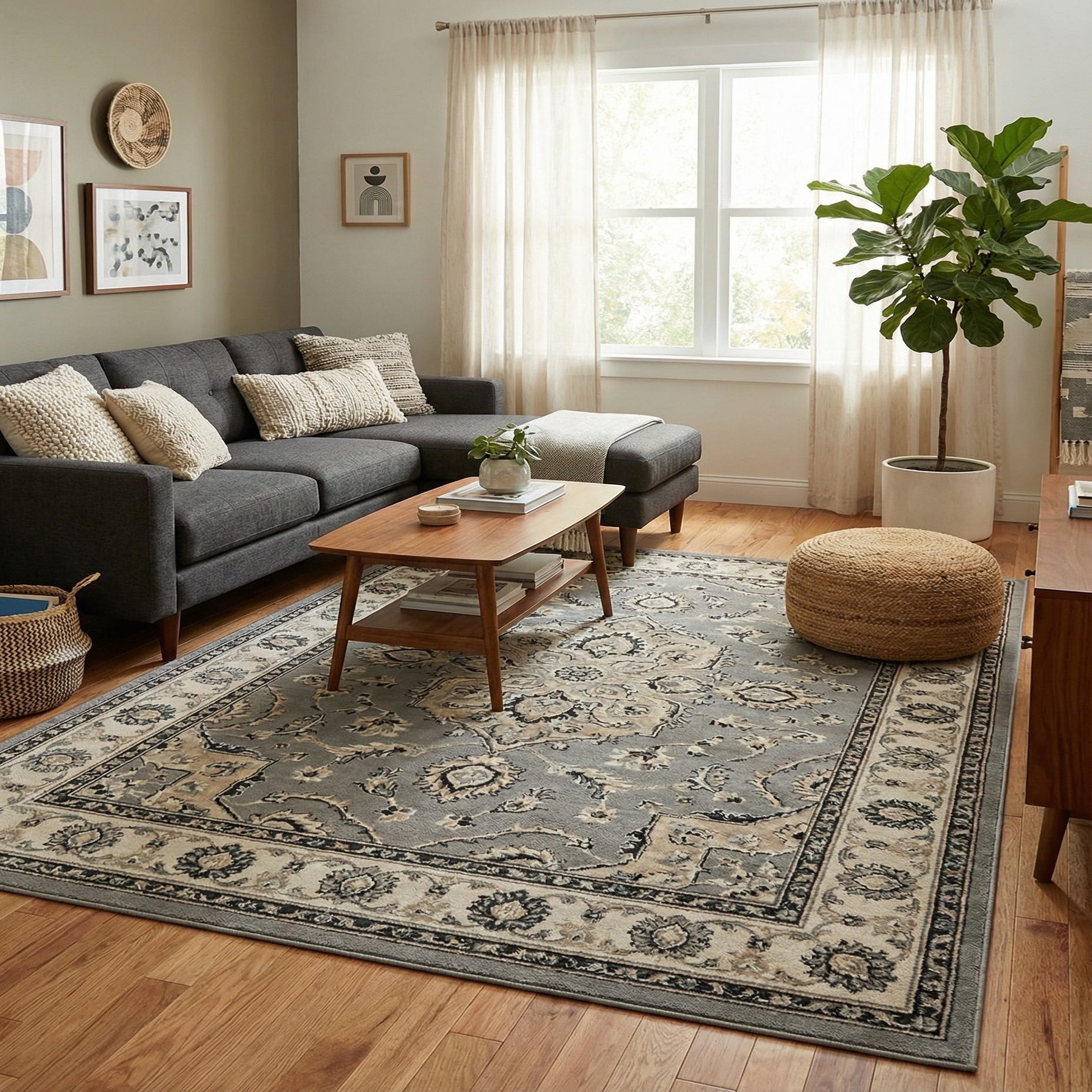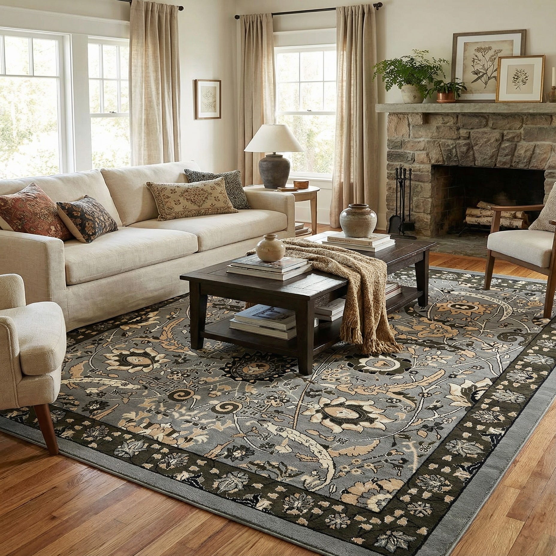 This piece works well as an anchor for a living room seating group or beneath a dining table, and it pairs comfortably with warm wood tones, neutral upholstery, or leather furnishings. Use it to add a composed, refined look to a traditional or transitional space, or to introduce a softer, patterned layer in a modern or industrial loft. The neutral color mix makes it easy to coordinate with ivory linens, tan accents, or matte black fixtures.
